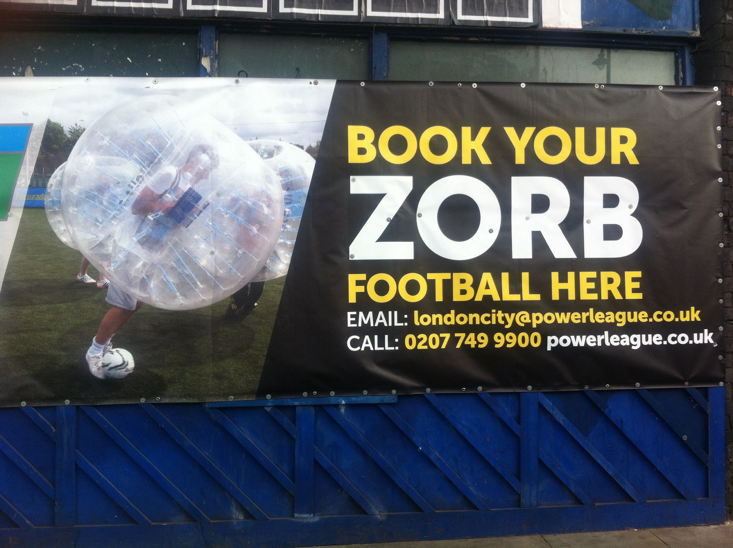 After I'd explored the containers, and I went in most of them I headed towards Shoreditch High Street. You can see London's skyline - with the Gherkin - in the distance. And then I walked past and advertisement for something I'd not seen before, and that's Zorb football. It looks odd, but oddly fun.
