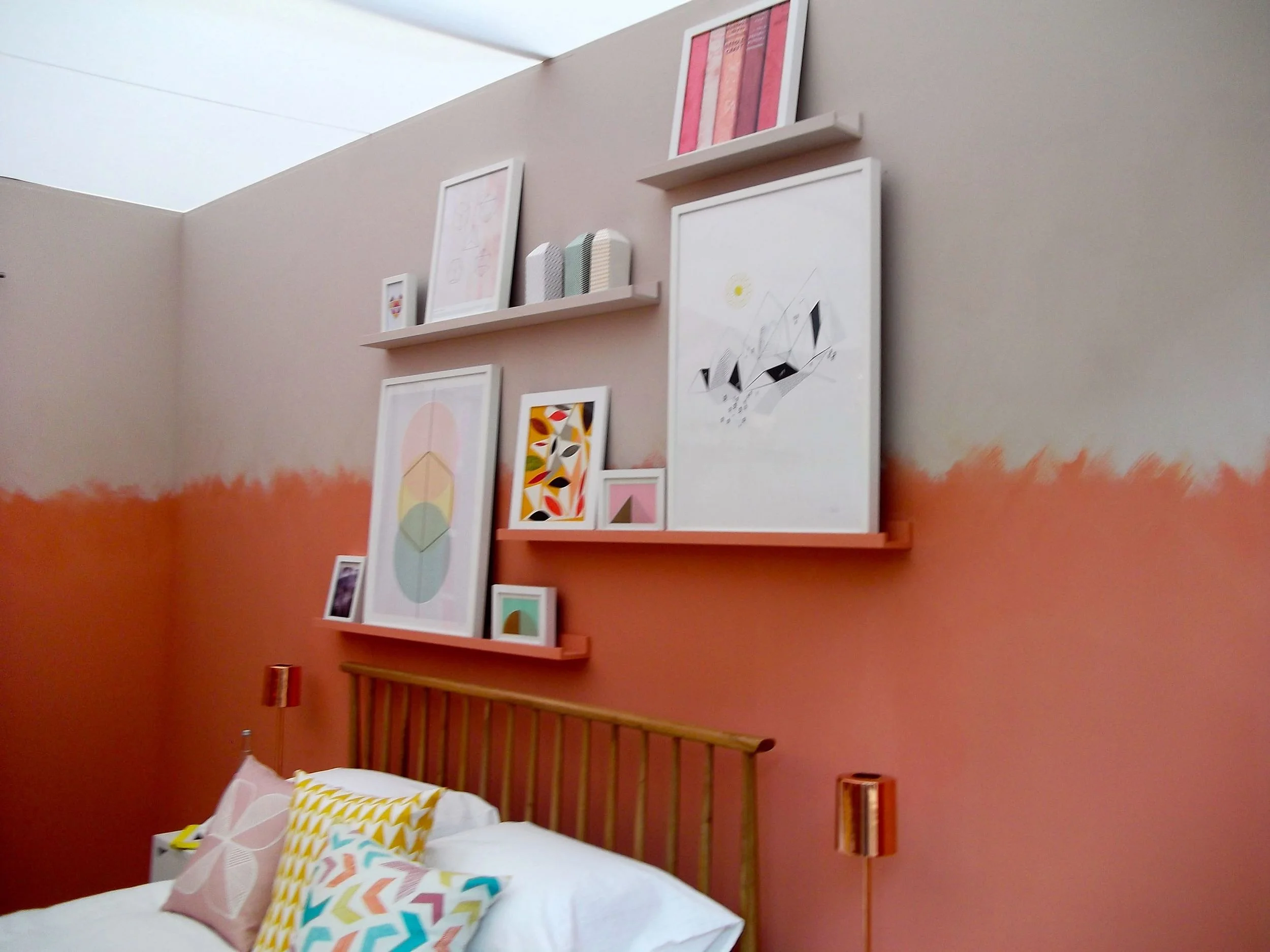 - Choose a warming clay pink colour for a feature wall and the lower wall sections, using a powdery pink colour for the upper sections.
