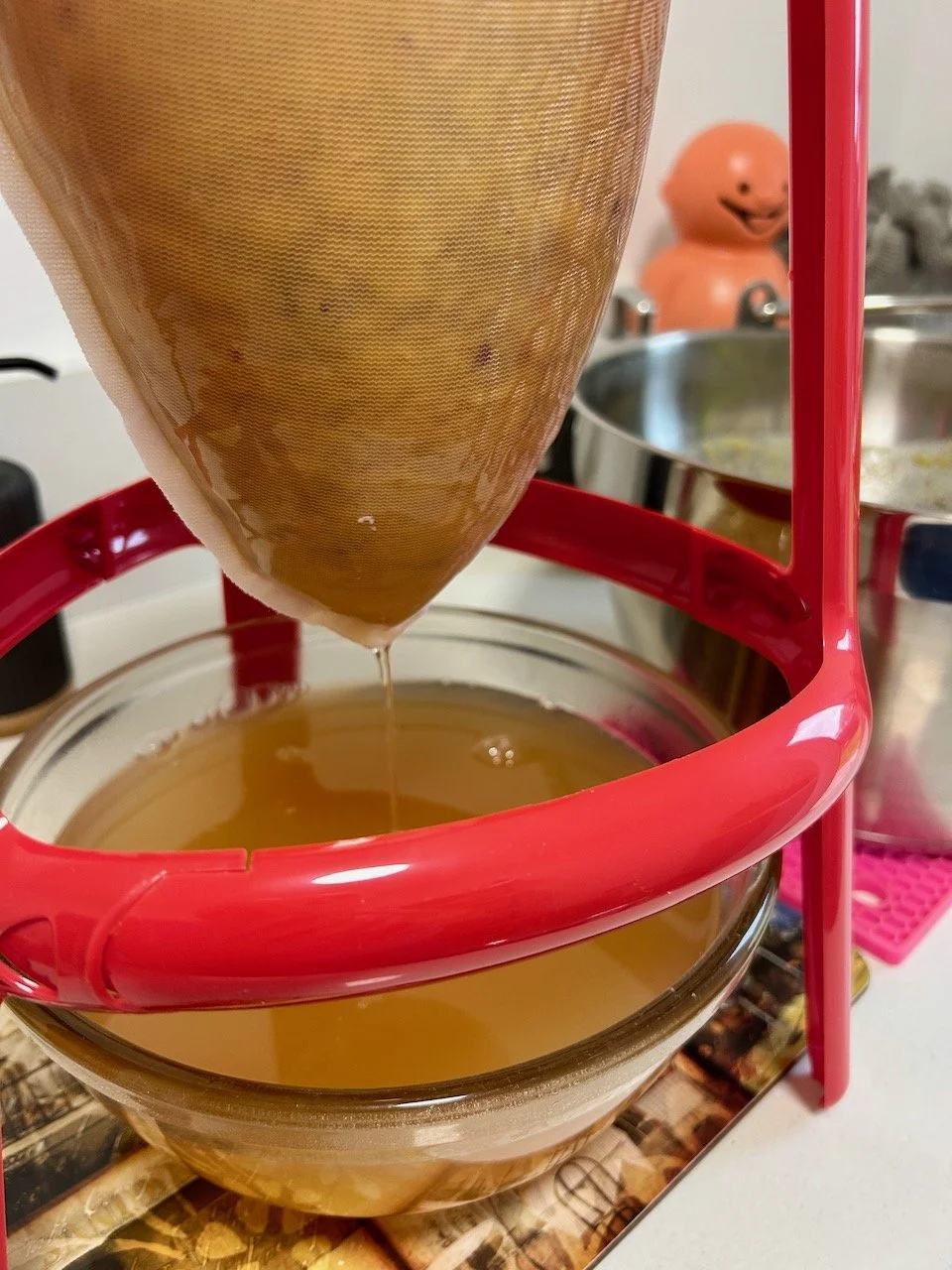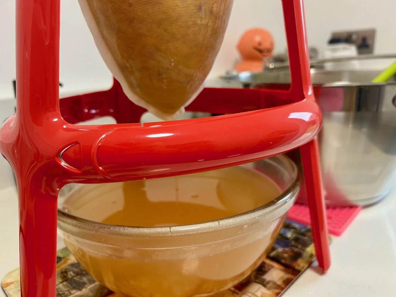 And so I left it to strain overnight, fairly confident that this bowl wouldn’t fill or overflow - and thankfully it didn’t. The jelly strainer didn’t collapse either, so that was double good news the next morning.