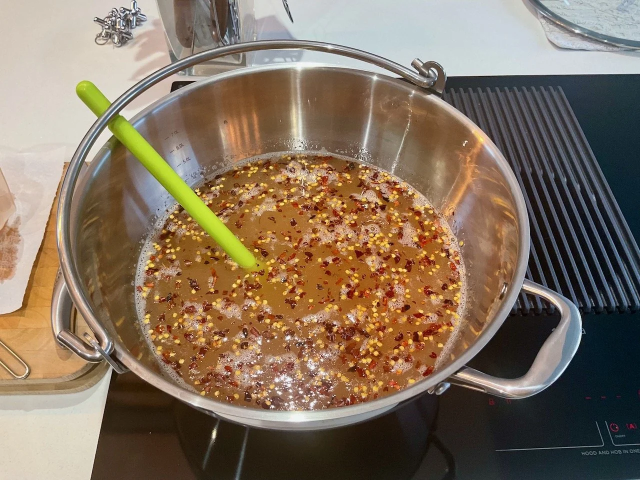As a fair few chilli flakes were left behind or removed when I skimmed off the froth I decided to add a whole dried chilli into the jars. This wasn’t as successful as I hoped as it floated to the top and isn’t visible from the outside - but it will be a surprise for the recipients, and will hopefully build a depth of flavour as the jelly stores.