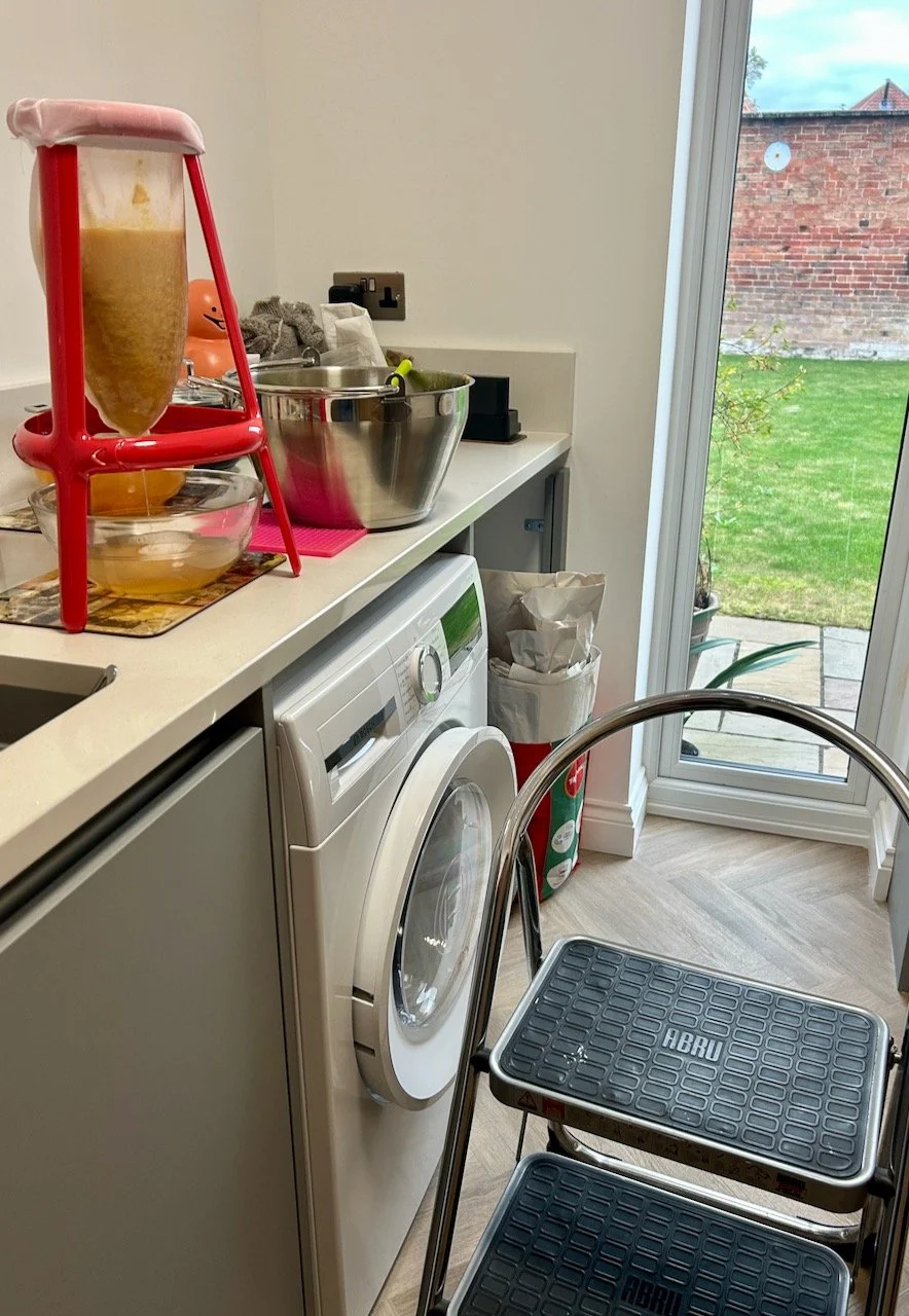 Well some creative thinking was needed, and out came the kitchen steps, the ladle and a jug. And it worked. Phew.