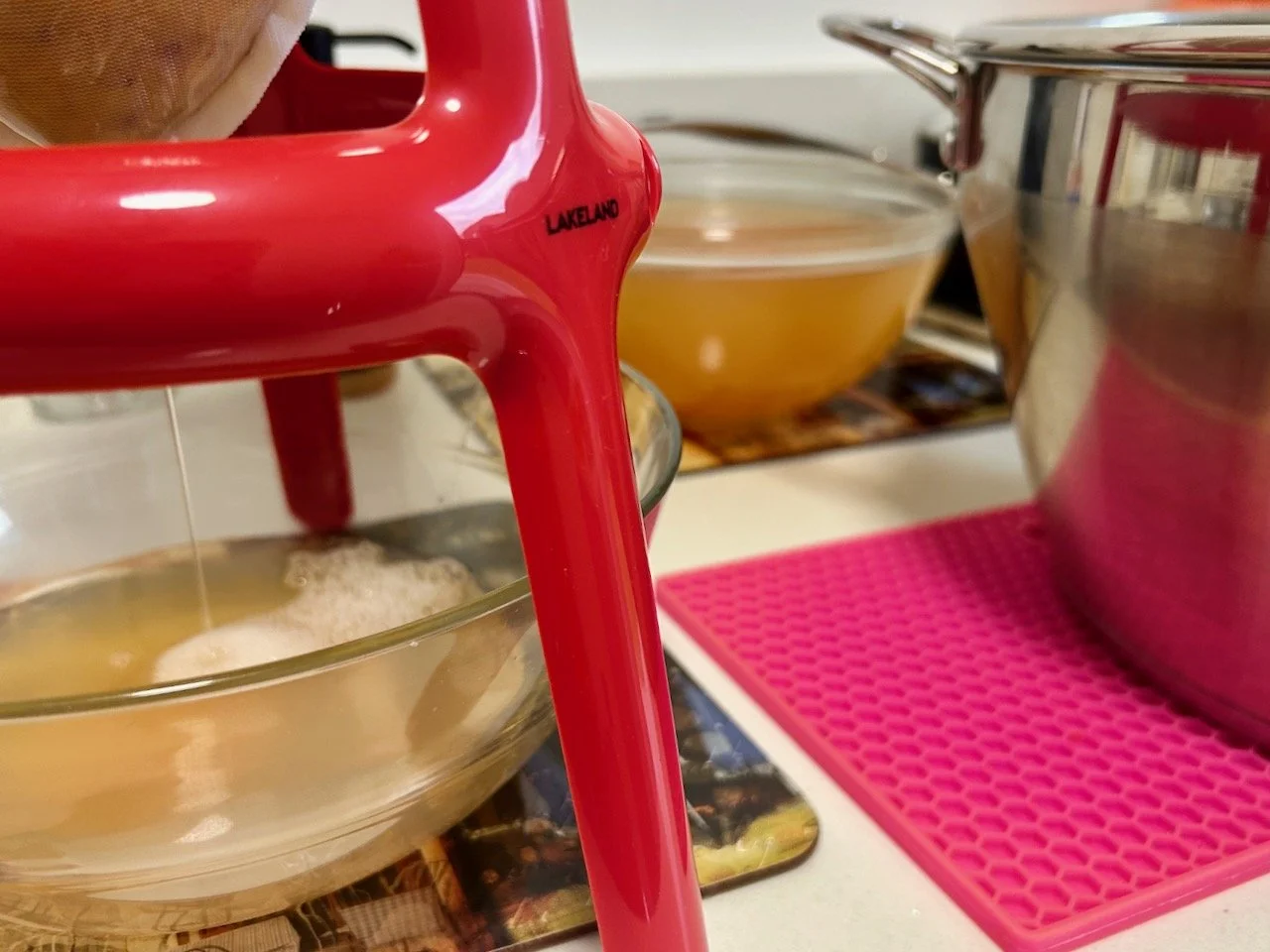 I’m so glad that I’d put some table mats under the jelly strainer as this helped me switch out the almost full bowl for its replacement, while the liquid happily continued to drip (well stream) through.