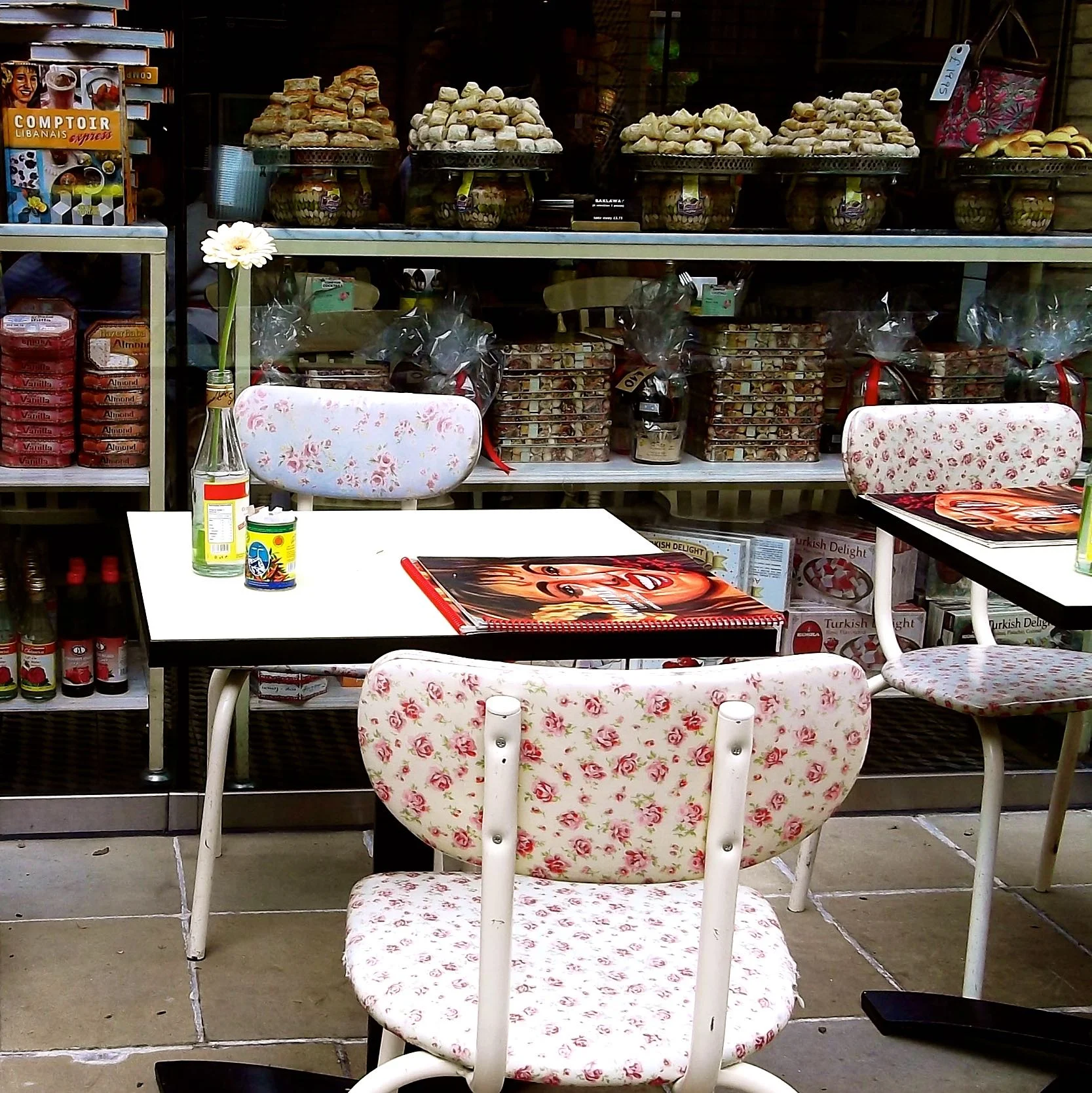 And then I was back at the Comptoir Libanais and before I left I spotted one last display in the corner of a shop window - and while this may not be my best photo, I love the reflection of the cafe and those pretty chairs at the top of the window.