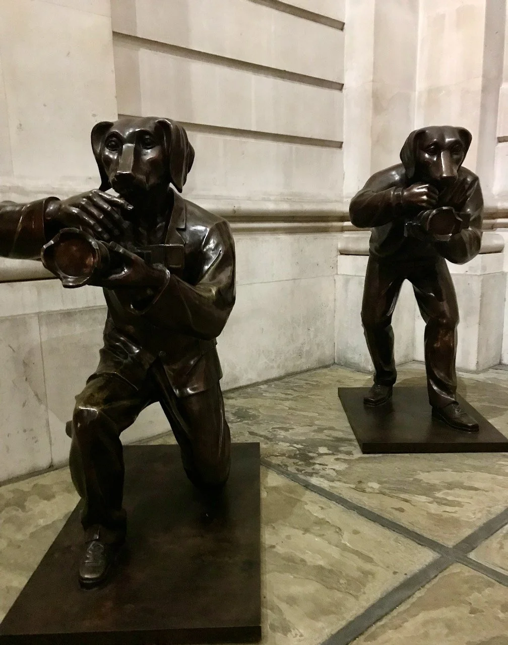 Designed to highlight the pack mentality of the media, the four Paparazzi Dogs have been travelling the world from New York’s Rockefeller Center to Melbourne’s Federation Square, Shanghai’s Jing’an Sculpture Park and Dublin’s Dundrum Town Centre, before arriving at The Royal Exchange to turn their lens on Londoners in a piece of public art that gives us all a taste of the glare of celebrity living