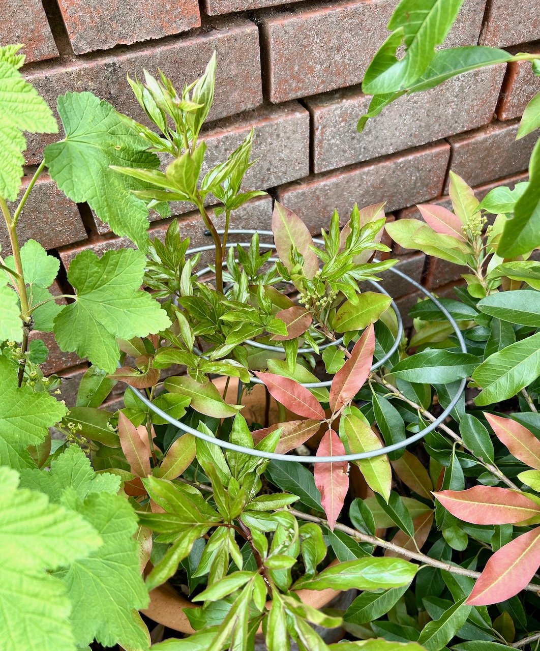 While checking to see how the pots had overwintered I was pleased to see the redcurrant plant which hadn’t really thrived in our previous garden was in leaf, but more surprised to see that one of the peonies has already started to grow though its circular support.