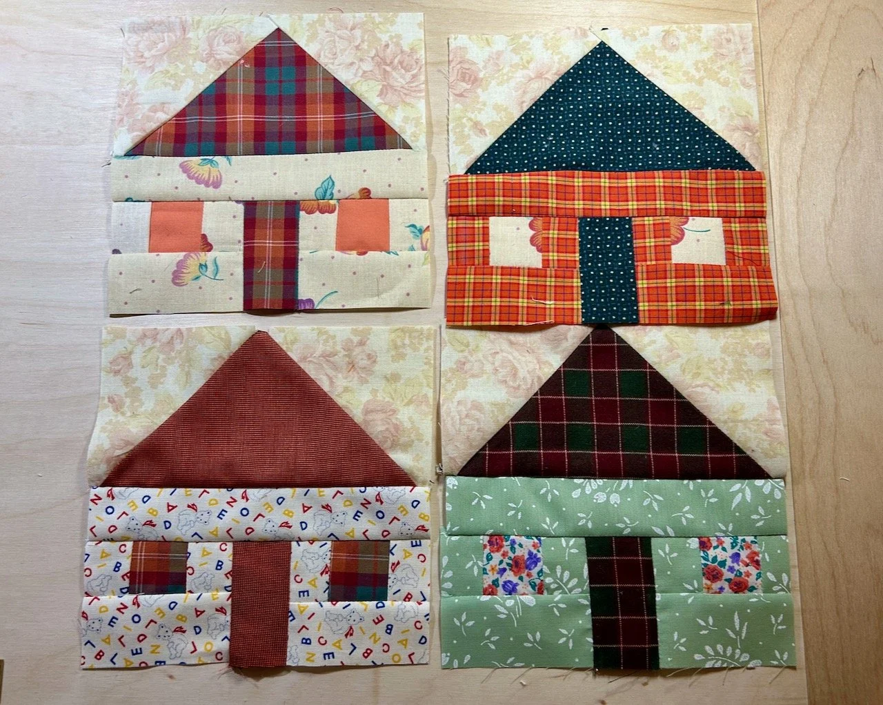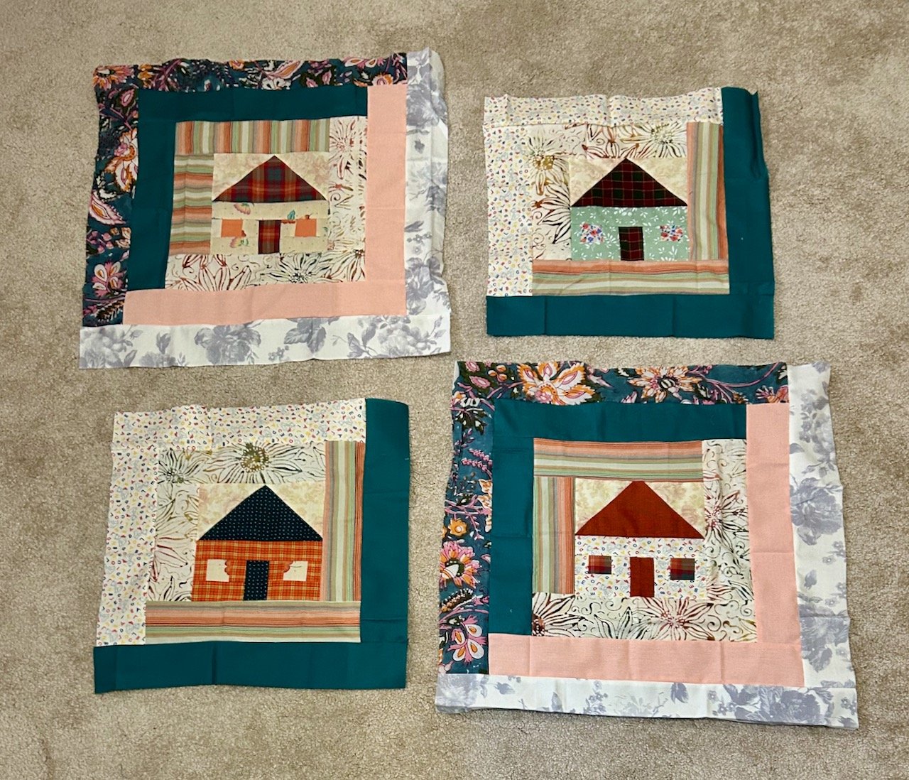 Having completed the test blocks I felt pretty confident to try the block for my own quilt; as well as learning how not to cut off the point of the roof, I also learnt that I preferred the darker border colours on the bottom half of the block, and the lighter ones on the top. Perhaps for this block because they were representative of the ground and the sky respectively - who knows.