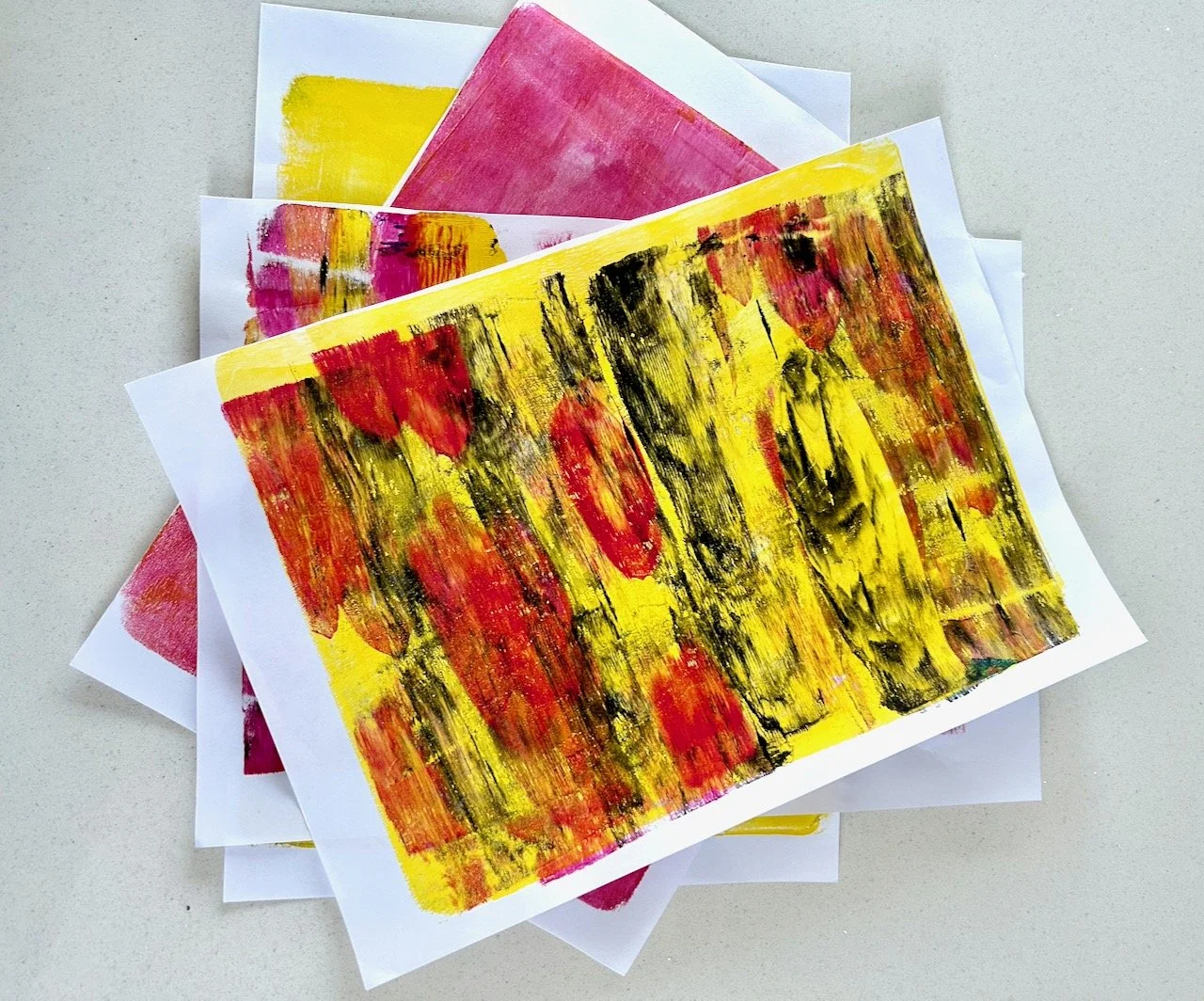 The gelli plate is still the same size, so with two (or more) colours you need to reduce the size of the paint blobs you add to the plate so it’s not awash with paint. I tried with yellow and pink, then some blue and finally some black - with mixed results.