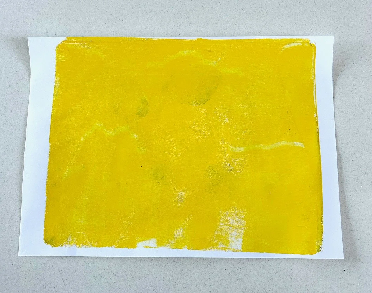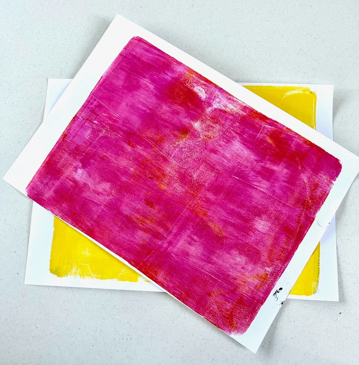 After an hour or so of chat, this was quite exciting - though I take your point, that it’s not really that exciting. But the point of this was to practice how much paint to use, and for that it was effective as my next print was barely there yellow, which I quickly printed over with pink.