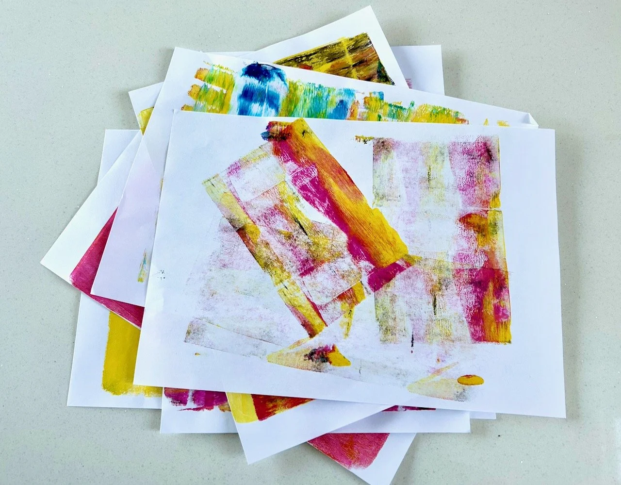 Because of how the gelli printing works you don’t need to clean your gelli plate in between prints, but it’s definitely worthwhile rollering off the excess paints in between applications. That’s not onerous at all as you can use a single sheet of paper for that, and it can result in some textured and very usable prints too.