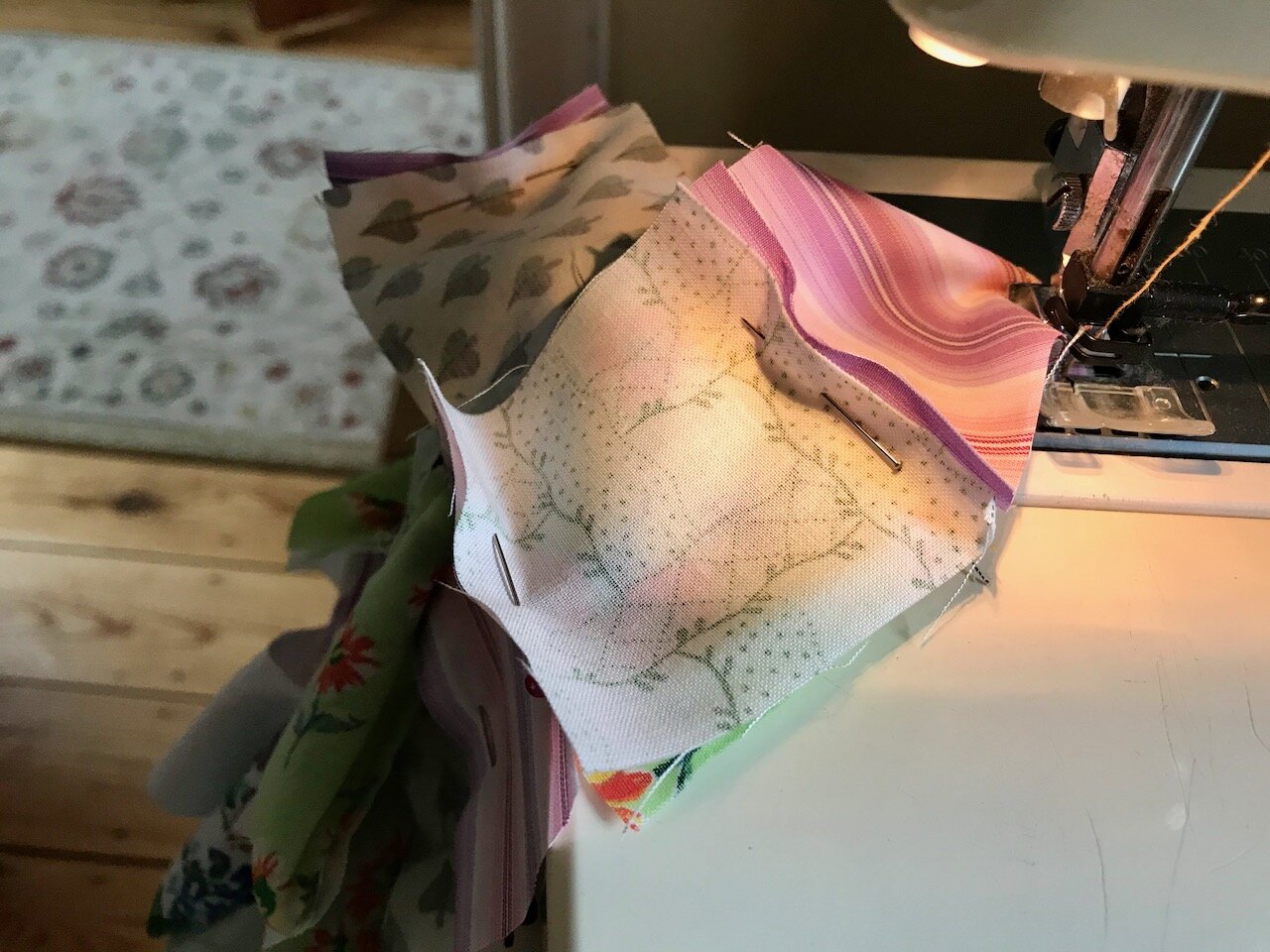 Which all meant, it was time to start sewing. I decided to pin a couple of blocks to speed up the actual sewing, and it’s a system that’s working out well for me. I currently have four blocks assembled, two more ready to assemble, two ready for the first seams to be pressed and another two blocks pinned and ready to sew.