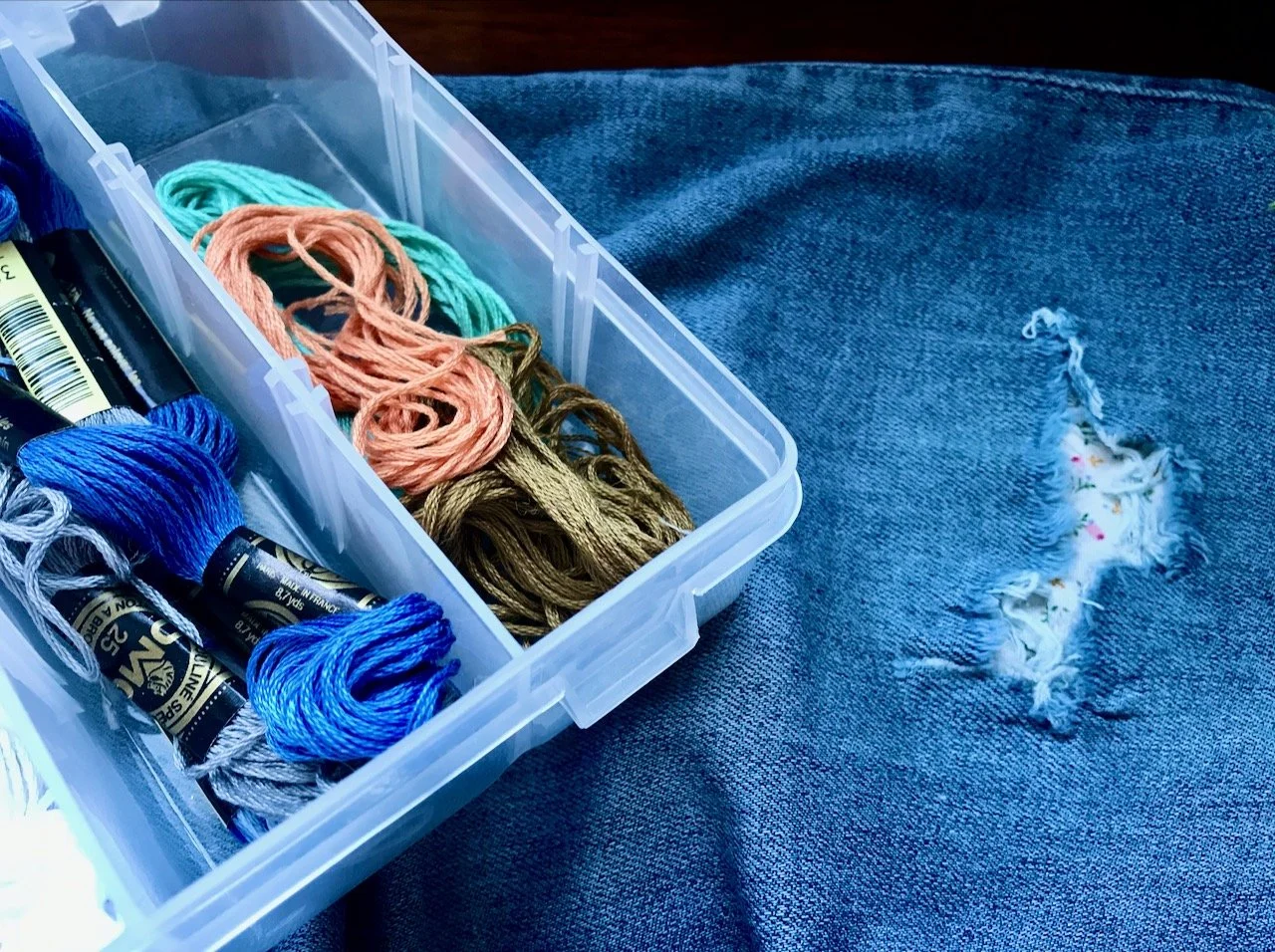 A box of colourful embroidery threads alongside the patched jeans