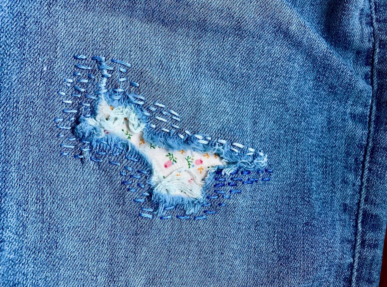 I decided on a few rows of simple running stitch to secure the fabric decoratively, and I’m really pleased how it turned out. It’s a pretty way of extending the life of these jeans, which apart from a larger than intended rip are perfectly fine.