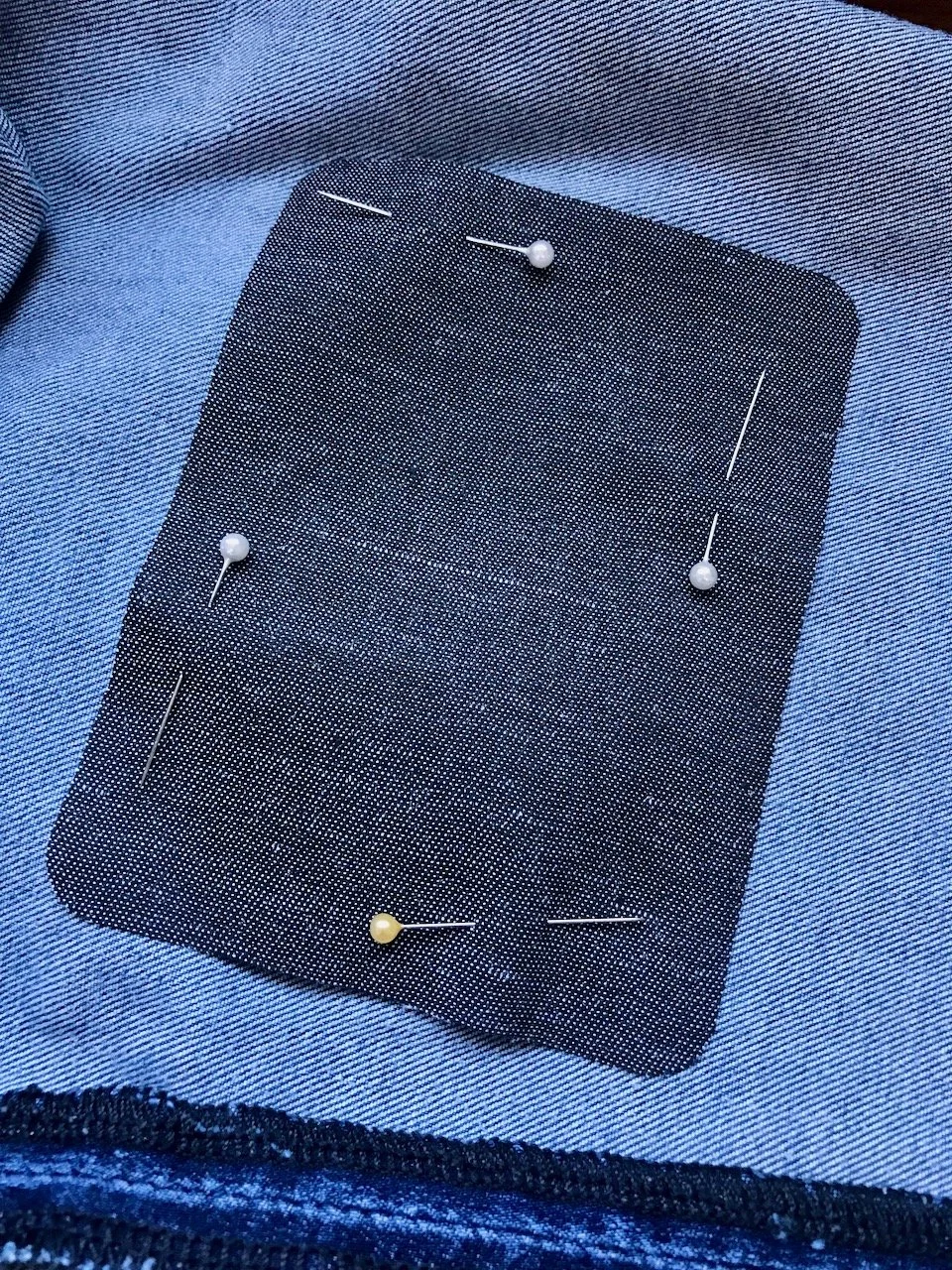 I bought a pack of iron-on denim patches - there’s patches for denim of every shade imaginable, and because I wanted to patch from the inside I chose the grey denim patch, as that’s the colour I’m least likely to own jeans in! I pinned that on the inside, remembering not to have the sticky side up, as sticking the patch to my iron wouldn’t be good at all.