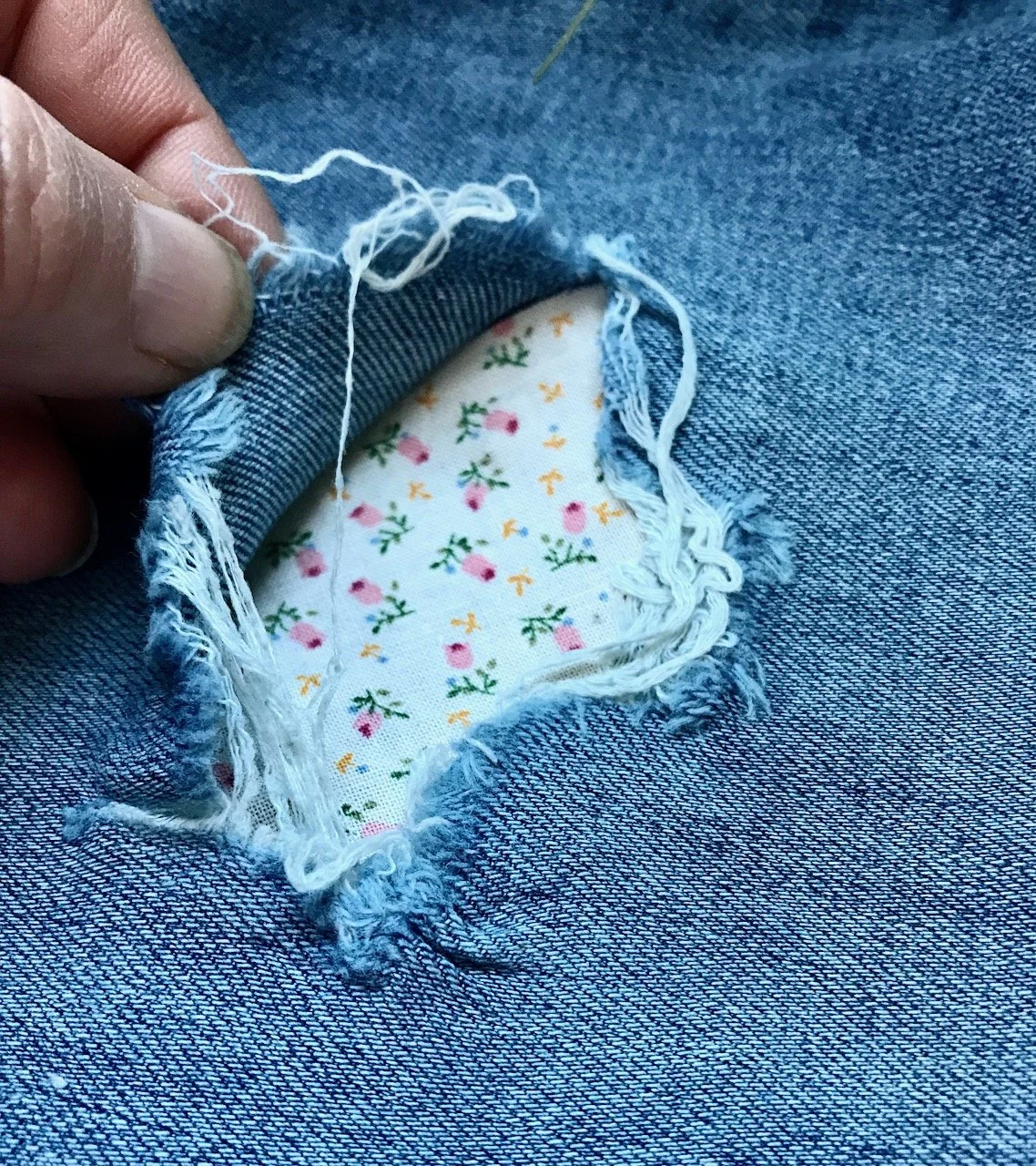 pretty and ditsy floral fabric inserted into the hole - viewing from the right side of the jeans