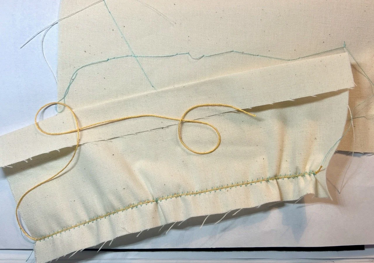 We had a go at gathering using a cord, which was interesting and also basting, the latter I found least useful (it’s the sample at the back in the photo below). I’d tried it previously as I thought it might be useful, I’d ruled it out then and my views haven’t changed.