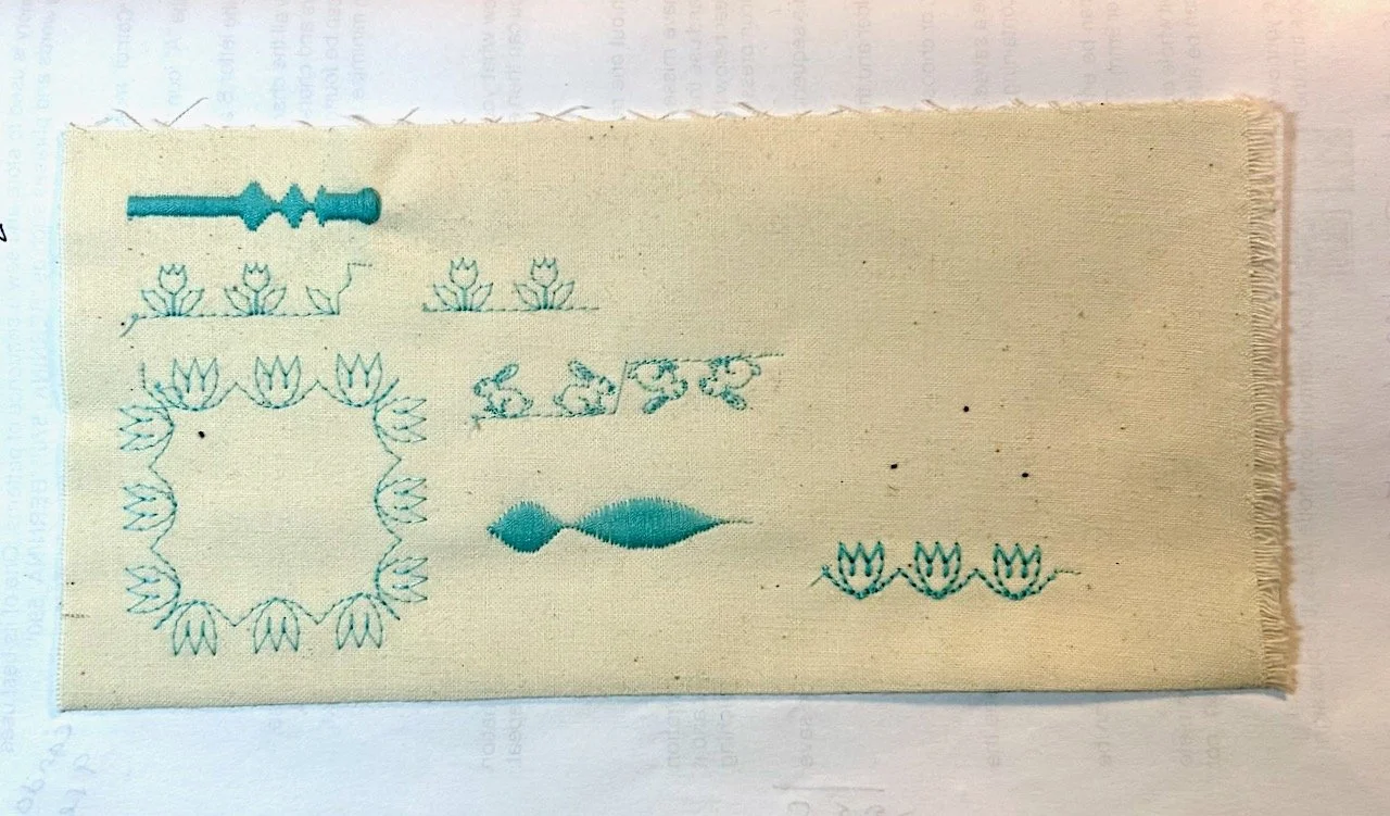 We started with practical stitches and needle positions, as well as learning some tips about automatic stitch sequences before moving onto embroidery stitches - including how to program the pattern end to avoid finishing mid emblem, as well as how to mirror those emblems - look at the bunnies in the image below!
