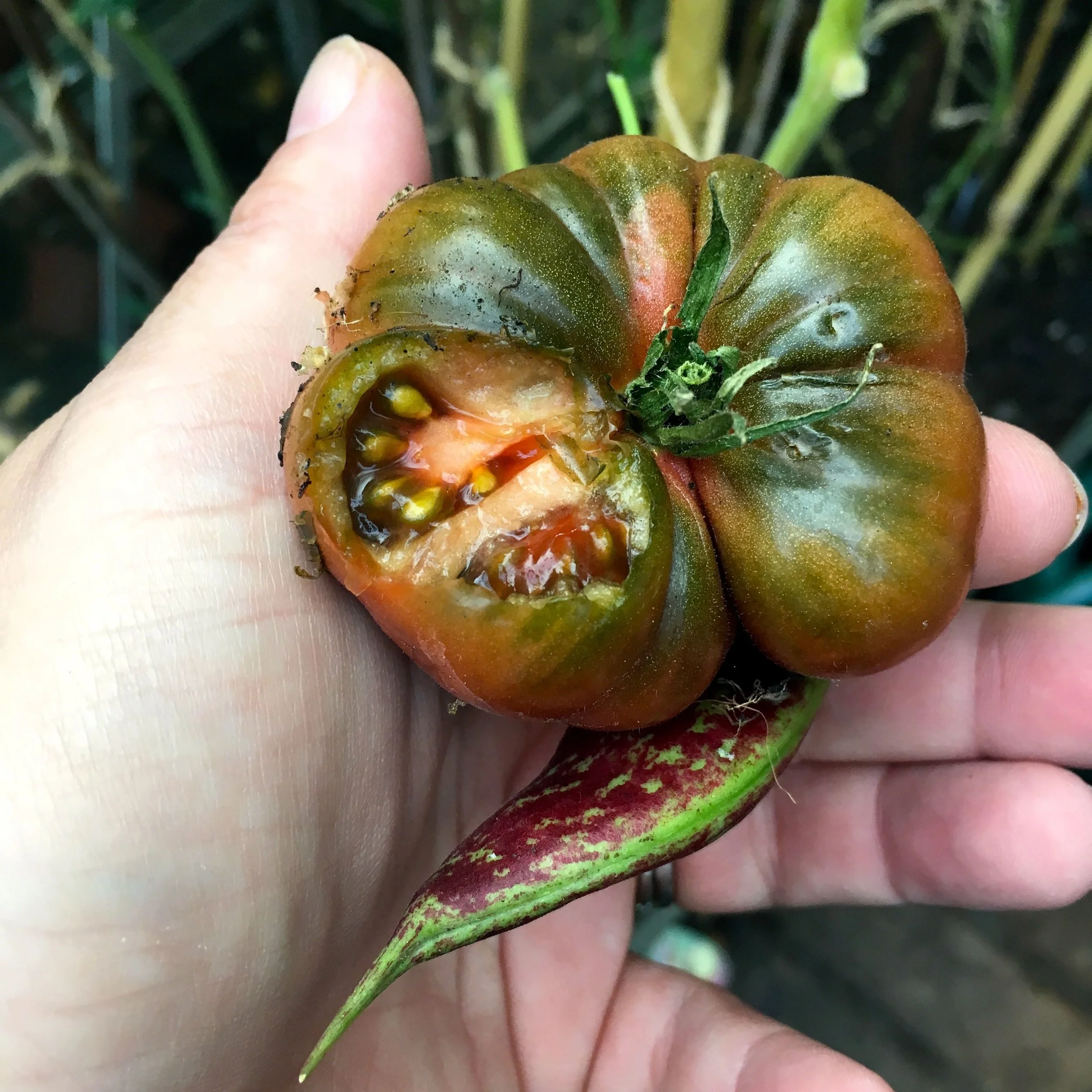 My ‘best’ tomato didn’t survive my week away. It looks as if someone, or something, else had their eye on it too and got there before me. They didn’t get my borlotti beans though, but as borlotti beans were in the meal I ate before being ill on holiday, I’m off those at the moment and our crop is drying to be used as seeds next year instead, as I’m hopeful that I’ll be able to look a borlotti bean in the eye by then.