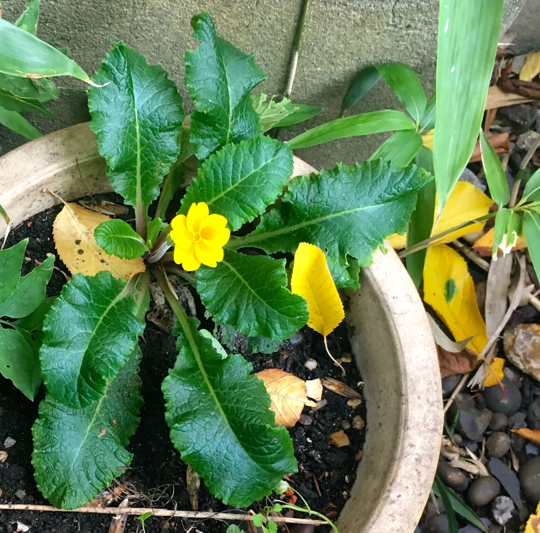 And behind the bamboo in a pot that we haven’t used this year I discovered a self seeded and flowering primula. I really don’t mind when plants self-seed, and I’m doubly impressed when they manage to get themselves into a pot too.