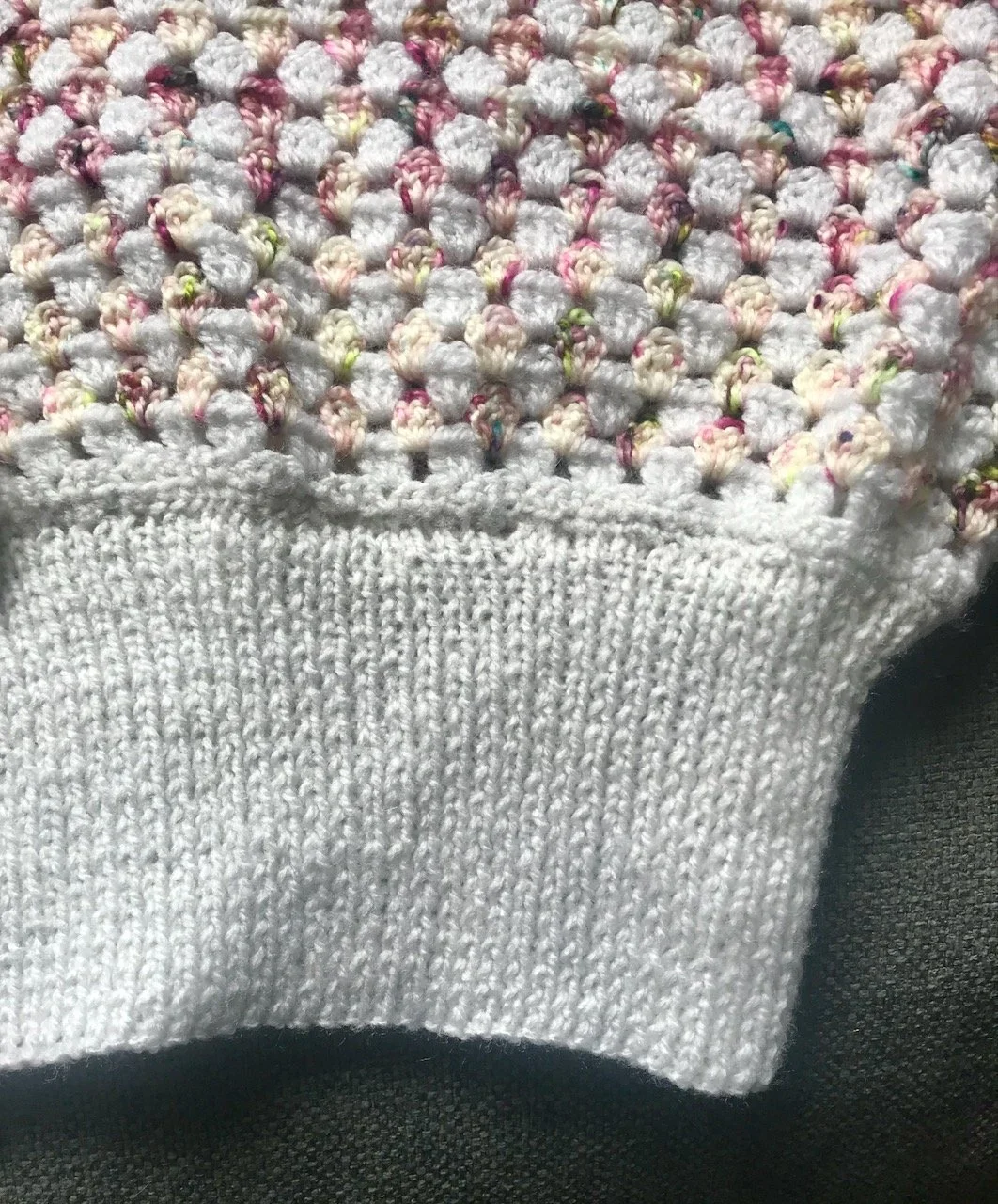 A close up of the bottom of the cardigan - the same granny square stitch as before, but also a deep knitted rib in the pale grey