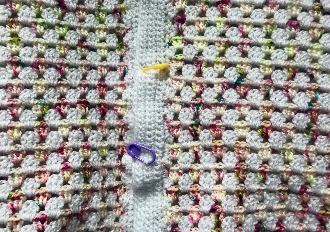 A close up of the body of the cardigan in granny square stitch (in rows) alternating between pale soft grey and a multicoloured pink, yellow and green yarn
