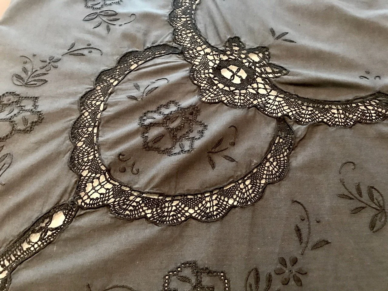 Close up of a lace tablecloth now dyed black with the white of the table showing through the lace