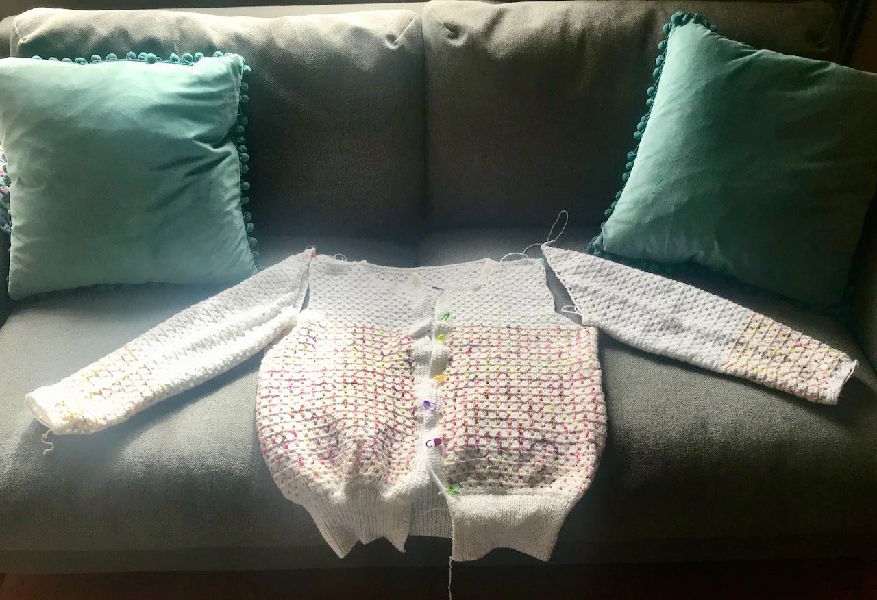 A crocheted cardigan - body and two arms - laid out on a sofa