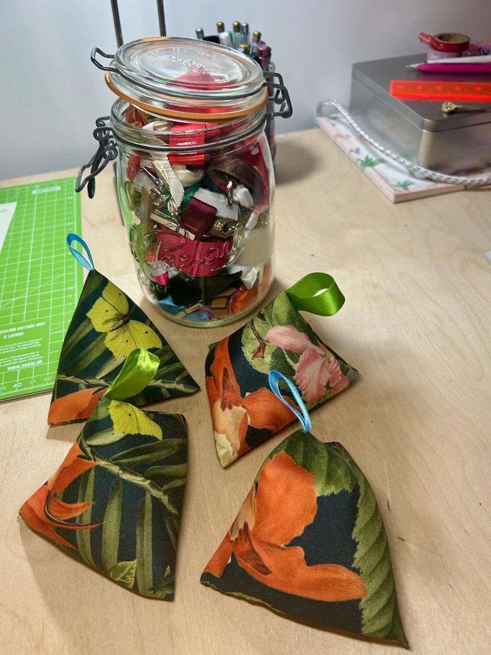 All you need is a rectangle of material, mine was a bit smaller than the suggested 11cm x 21cm, a piece of ribbon for the finger loop, plus something relatively heavy to fill them with. I used rice for these, but would consider adding some dried lavender along with the rice to any future ones I make - as rice alone doesn’t have the greatest smell. I wouldn’t use too much lavender, or lavender on its own as I’d be concerned that the oils might seep through the fabric and onto the fabric I was cutting out.