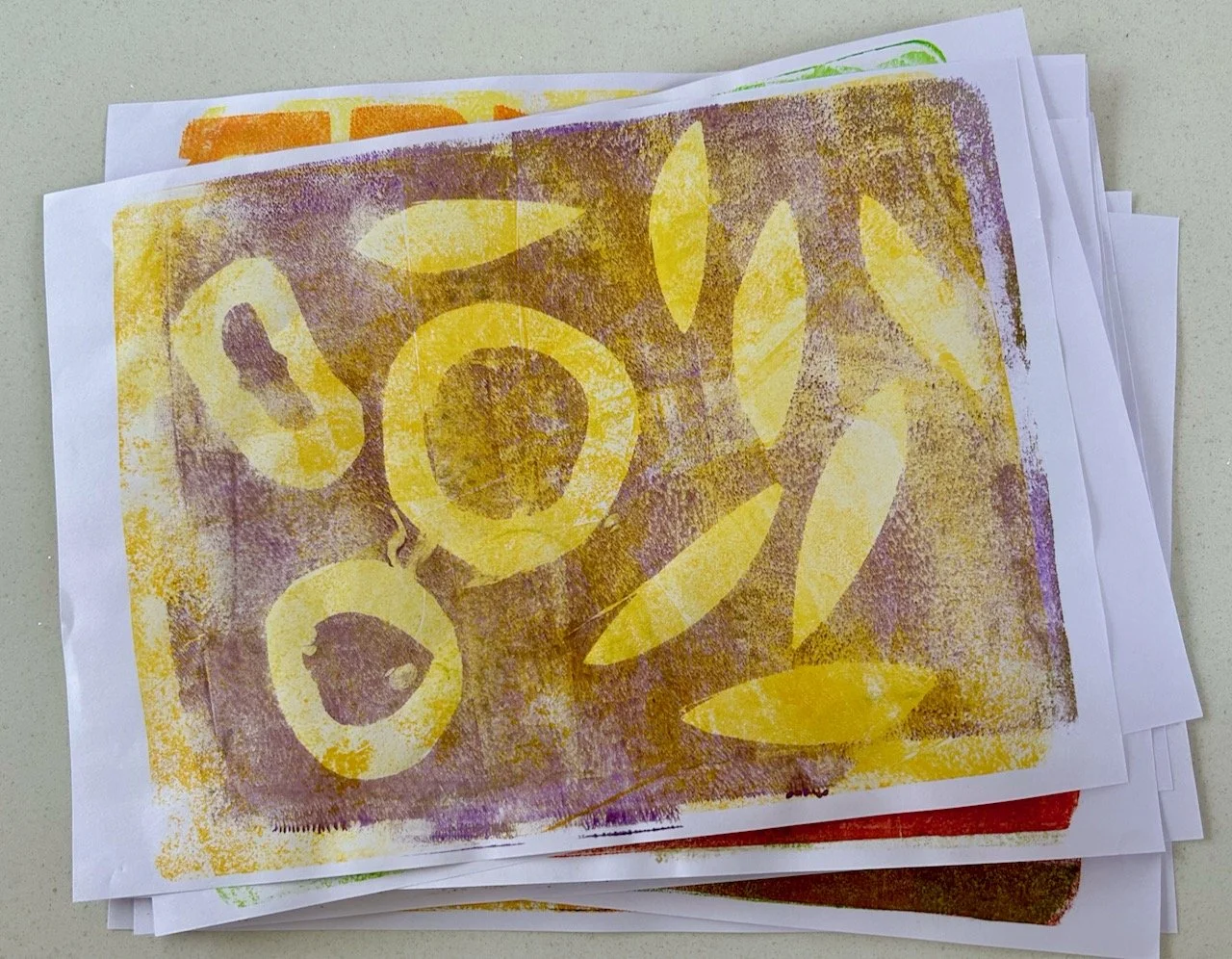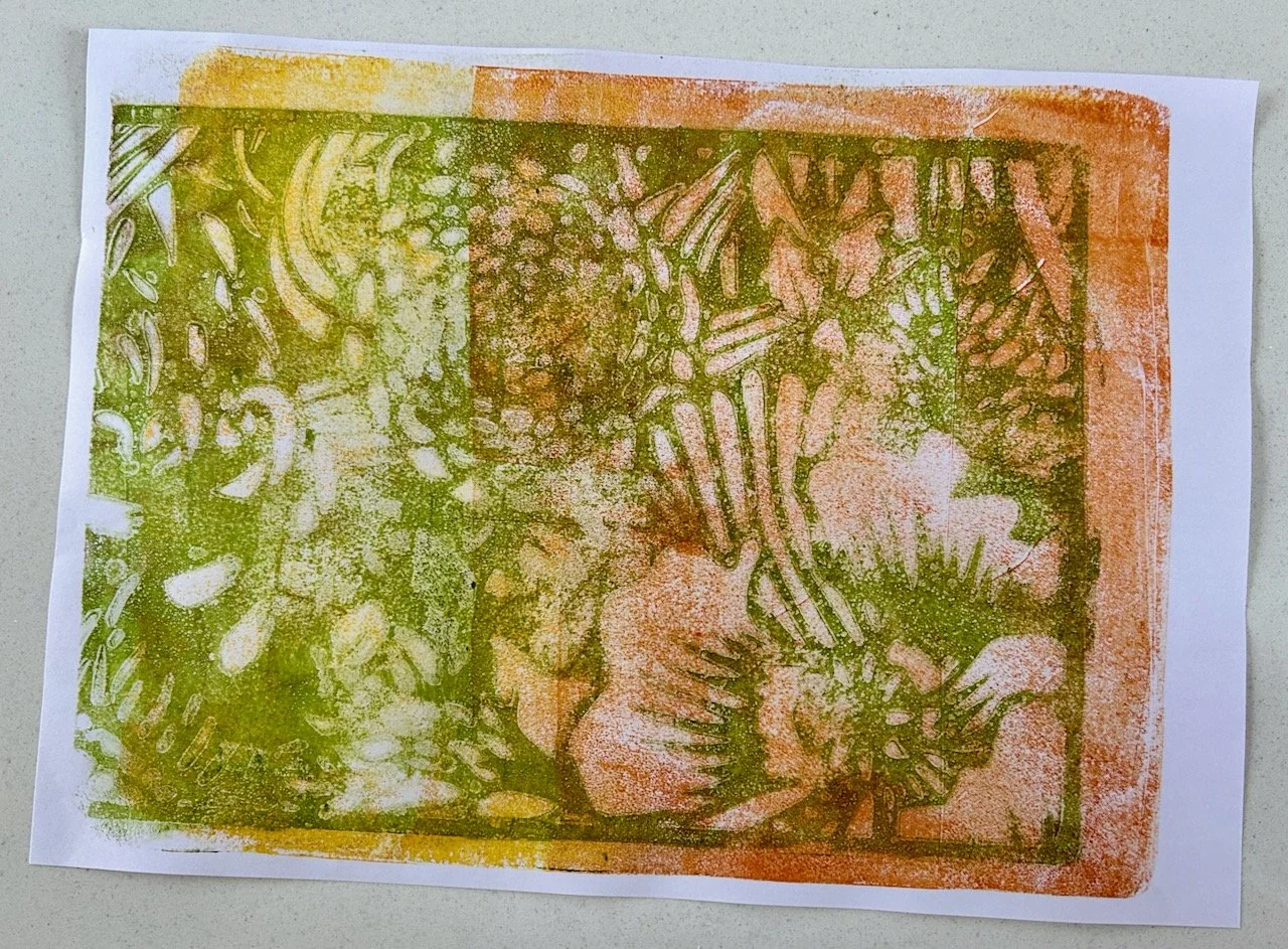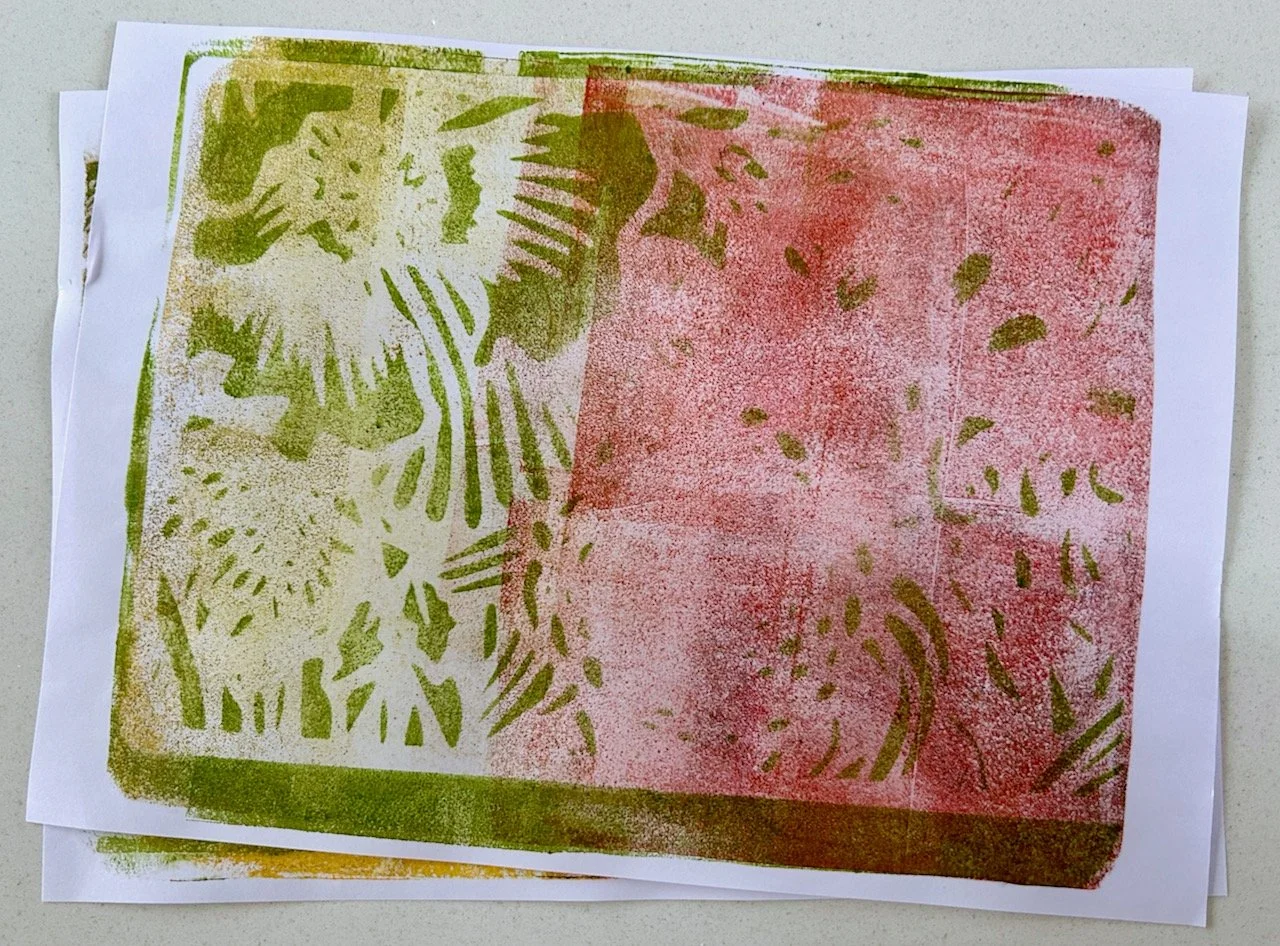 Unlike using stencils the second pull using the same paint application didn’t really add anything, the outline shape was too feint to keep. But all was not lost as the beauty of gelli plate printing is that you can reuse prints that don’t quite work out.