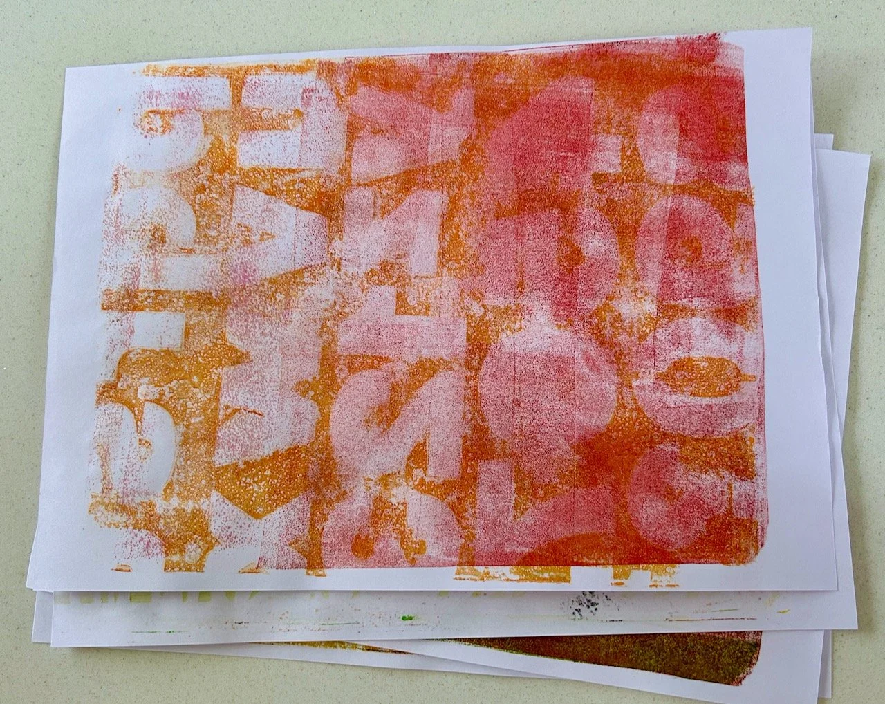 I also tried an alphabet and number stencil. I didn’t reverse this as partly this was a test of the process, but also it’s not text that needs to be read, however if that wasn’t the case the stencil will need to be reversed to avoid the mirror effect. Again I pulled two prints from a single paint application, and the softer second print is definitely my favourite of the two.