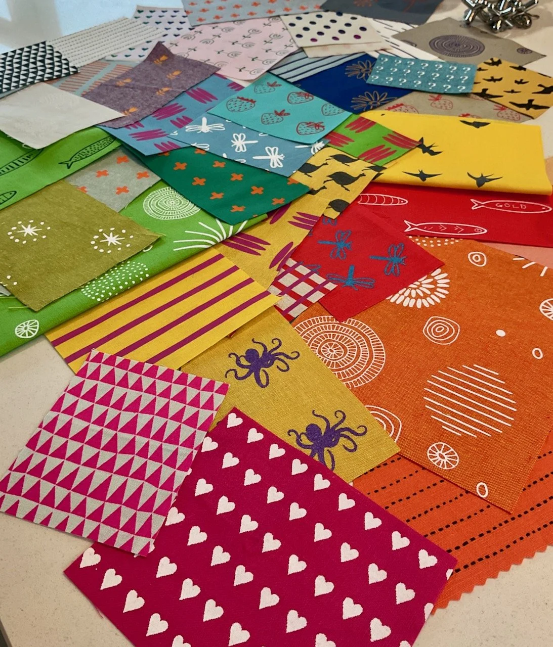 This one wasn’t supposed to be on the list, but it made itself known shortly after I bought the brightly coloured screen printed scrap box from Helen Steele (pictured below). The scraps are of varying sizes but to maximise how many I can use I plan to cut them into 3 inch squares, and sew together to form a brightly coloured cross, or kiss and use a darker fabric as the background.
