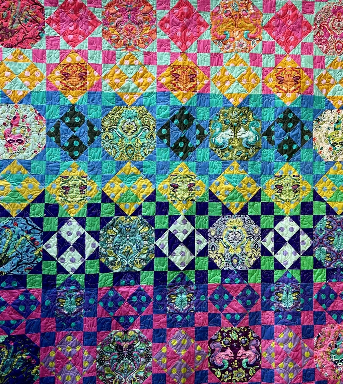 The colours! The patterns! What’s not to like? This is Lisa’s first quilt in Tula Pink fabric - it’s easy to see why she’s smitten, but all the fussy cutting might have done me in!