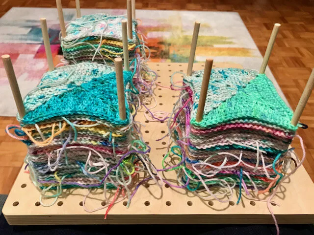 I have now completed four squares of each of the twenty four days, so that’s 96 squares, and a jumble of colours. And now I have a decision ahead of me.