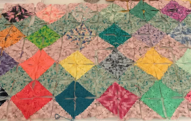I already know how I’ll finish this throw. Once I’ve settled on a final random layout, I’ll add a couple of rounds in the neutral colours. And then, my plan is to add a round of bobbles, or pompoms from the small lengths that remain. I’m sure though, that will bring my ordered head as many challenges.