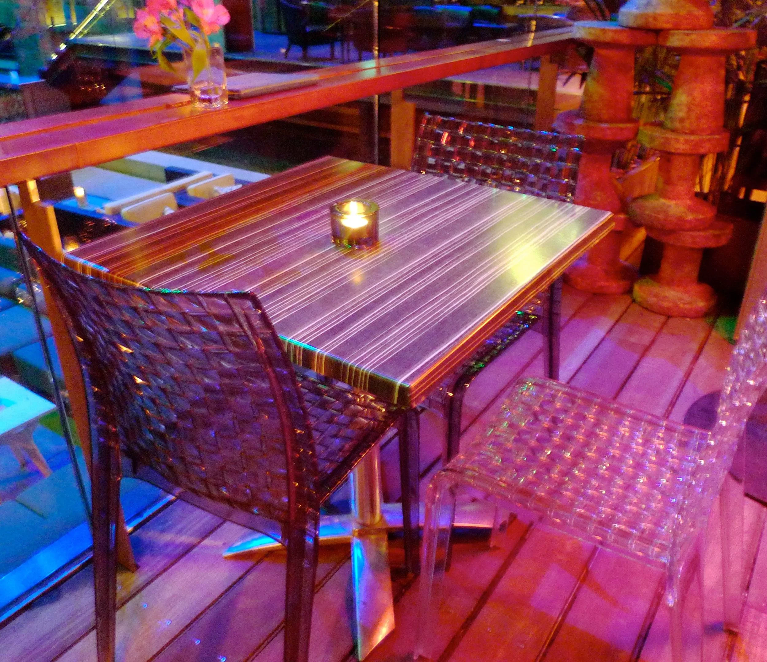 I was quite taken with the furniture there too, as well as a sunken area with comfortable seating for a more relaxed after work drink there were these fab tables and chairs. So much detail and interest and super chic at the same time, they really dazzled under the colourful lights.