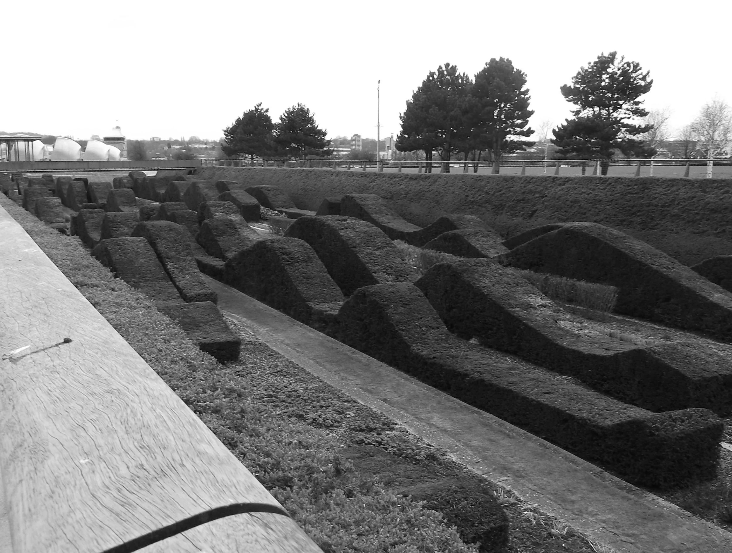 So after emerging from the Greenwich foot tunnel and cycling to Trinity Buoy Wharf we were adopted by a group of cyclists who were heading the same way as us. As we were exploring and they knew the way we willingly tagged along as they led the way to the Thames Barrier Park. As we cycled into the park through the huge yew hedges I got a glimpse of what was to follow.