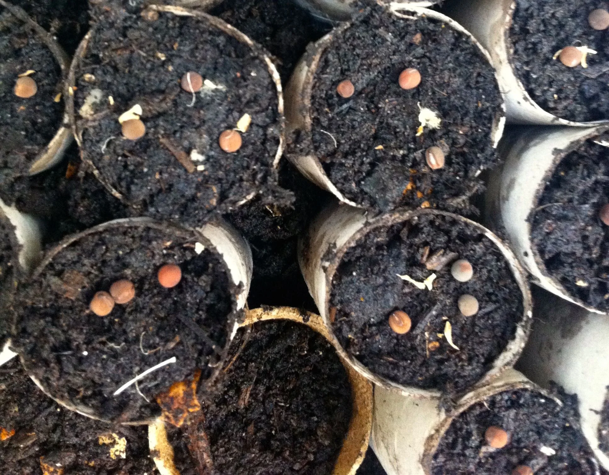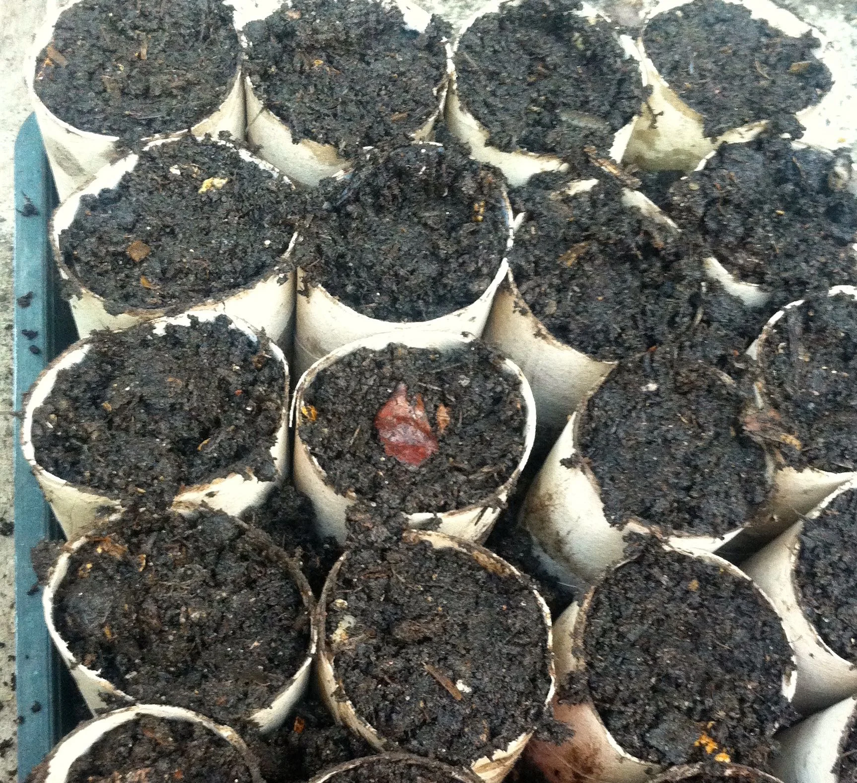So onto some beans. As well as hoarding all those seeds it seems I've also got a thing for those small little brown pots that disintegrate when you plant them out, so I've resolved to use those too. These have got some Purple Teepee dwarf beans in, there's not much sign of life yet, but I'm still hopeful.