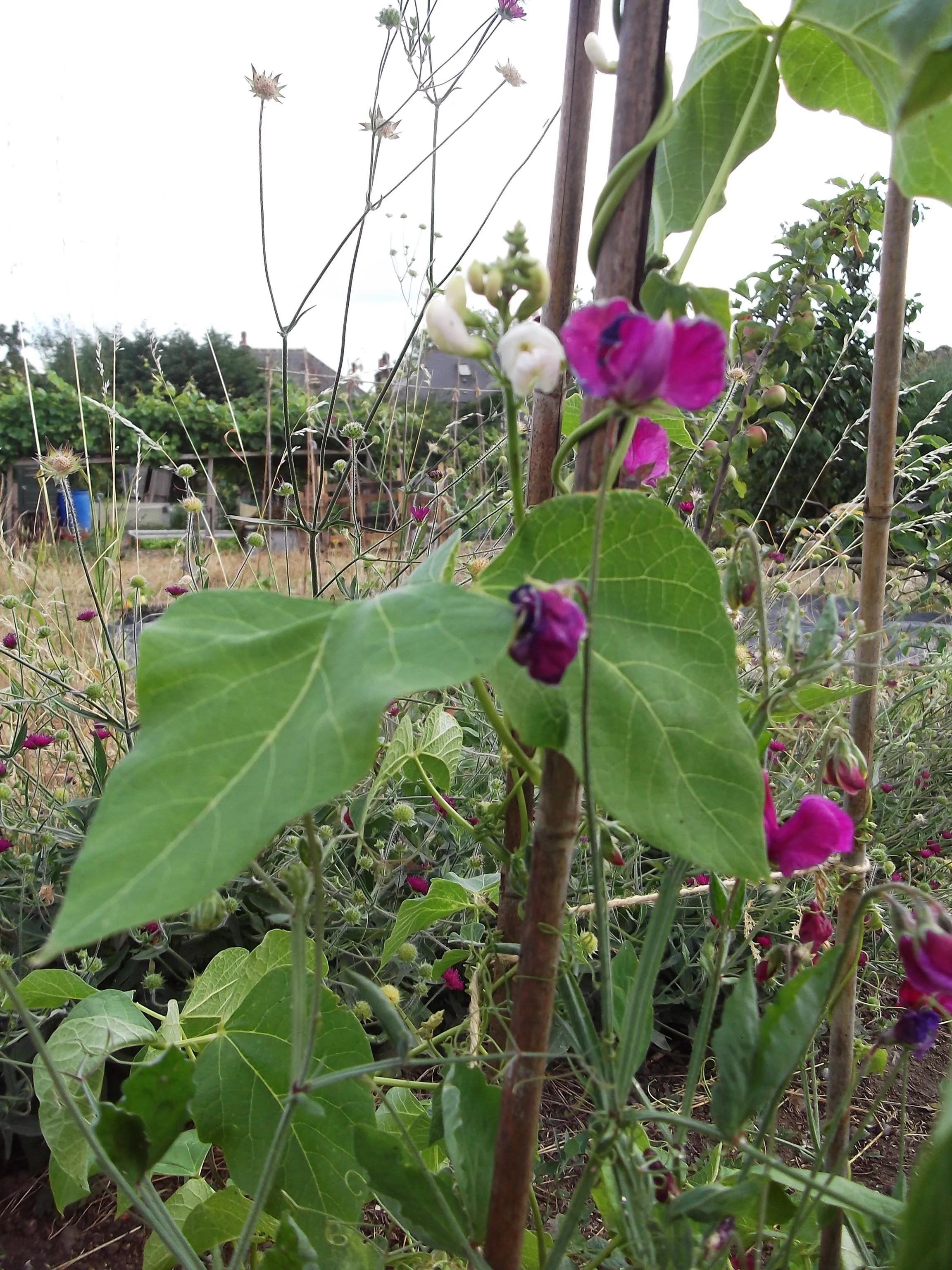 I've two lots of beans on the go, these on the wigwam were planted direct in May and they're doing well. I've got red and white runner bean flowers and the sweet peas growing alongside them bring some extra colour.
