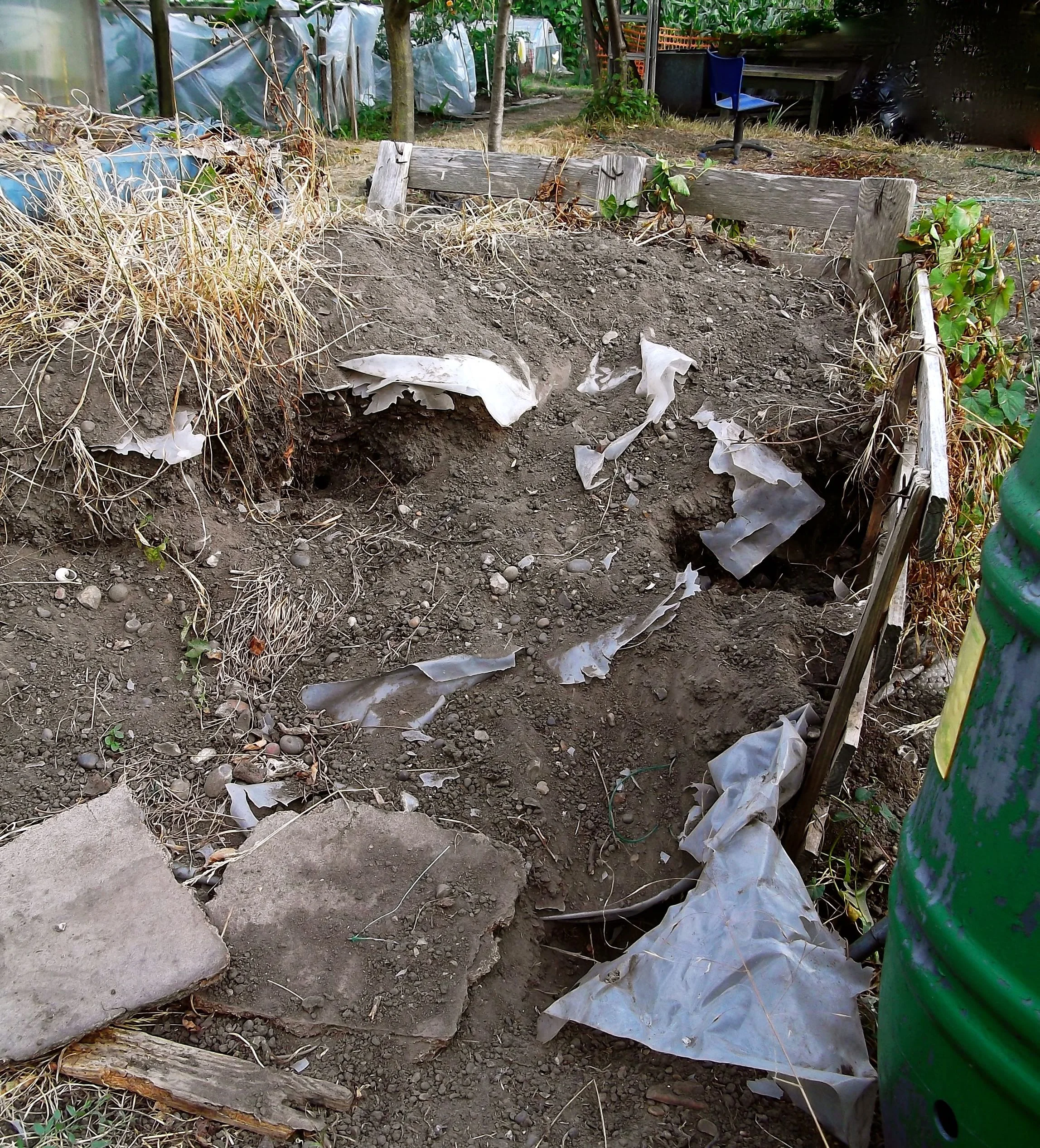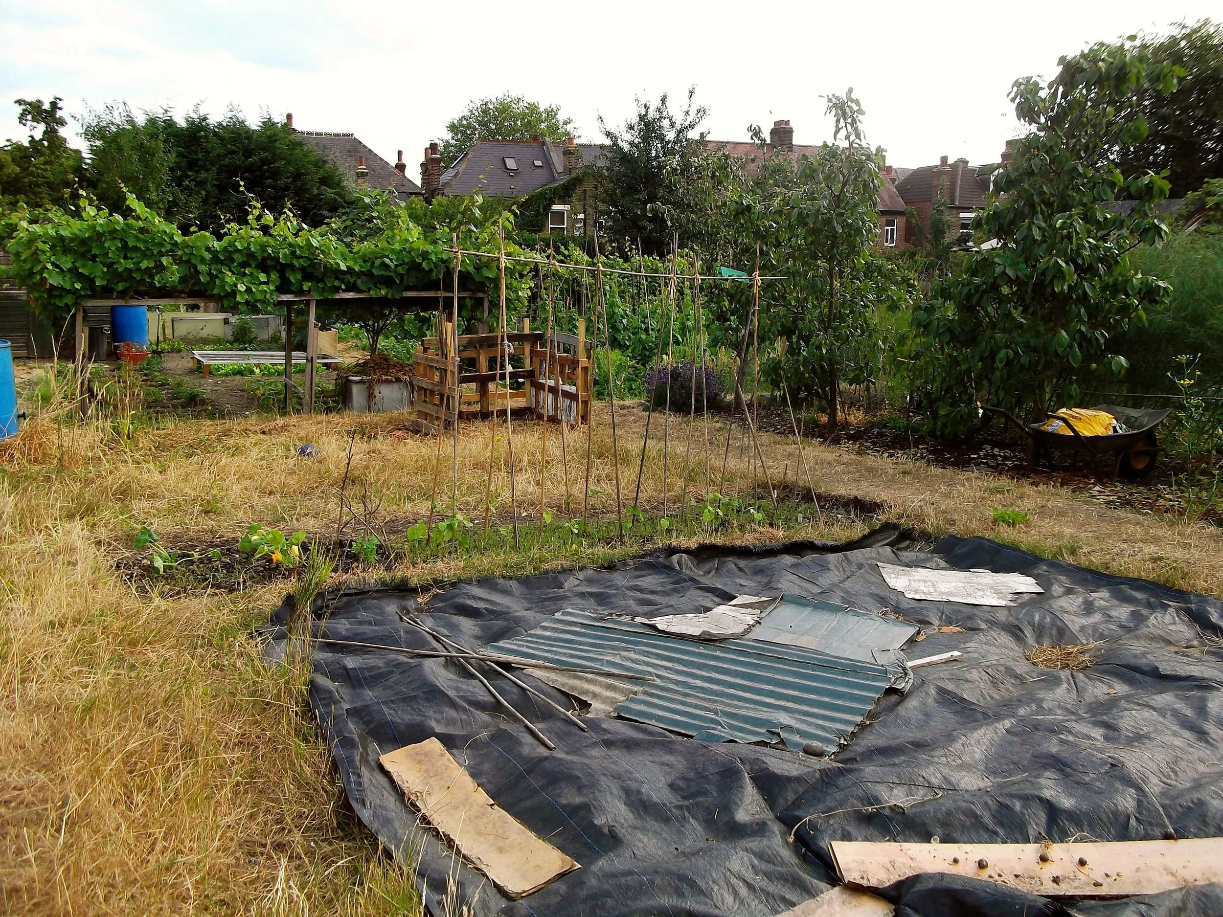 The existing compost bins are still there, at some point we'll need to tackle these. There doesn't seem much evidence of the foxes in the second more earthy compost bin which is good news, but it's hard to turn over and remove the soil as there's plastic in the soil. Sorting these out remains on the list, but for now it's more important to get some crops growing.
