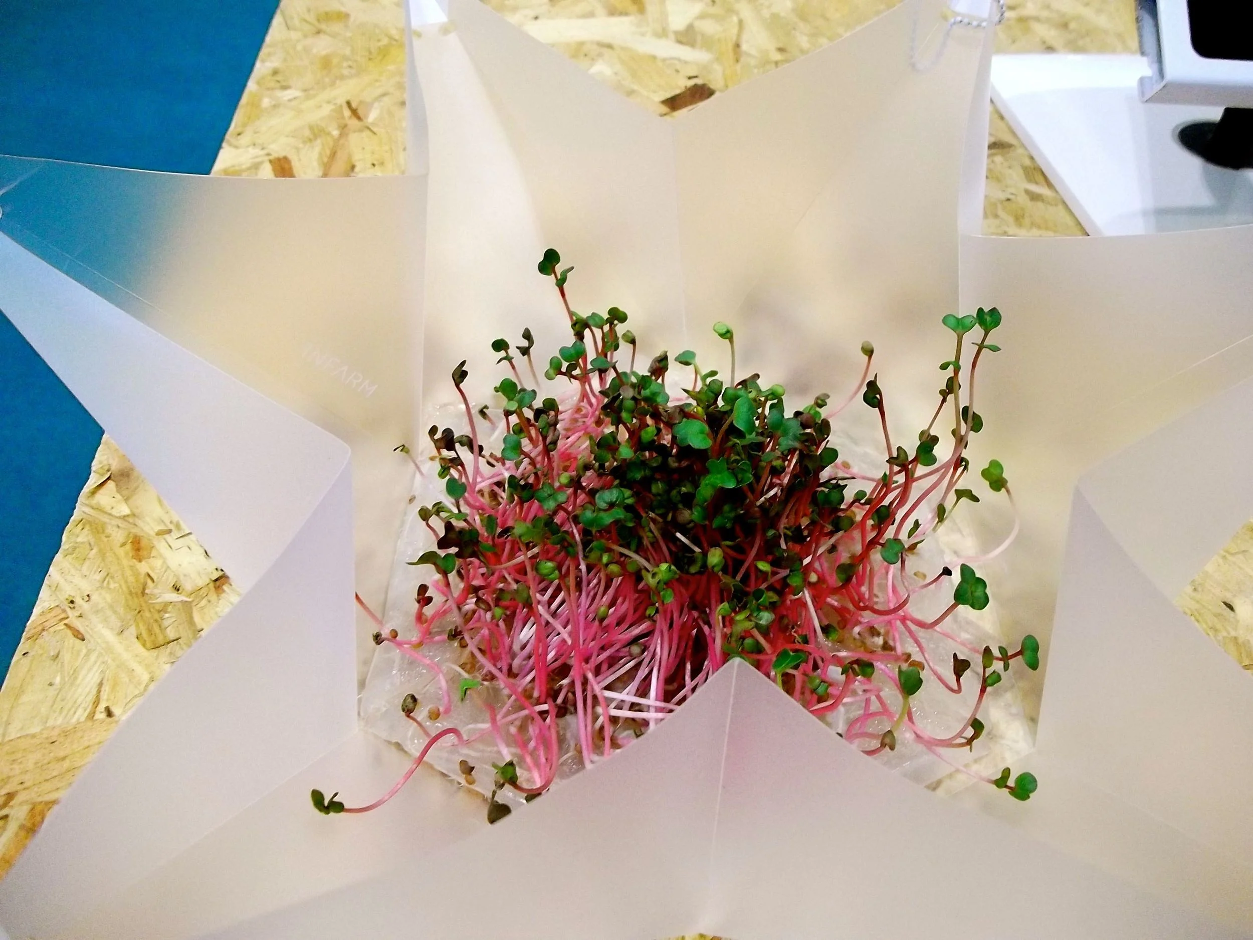 Let's start with the Microgarden, which is as you might have guessed inspired by origami. It's a kit for a mini-greenhouse, made from a transparent waterproof material which allows you to watch the entire growing process. You might be thinking what's so special about this, but after 10-14 days, without watering once, the microgreens are ready to eat. So it's a fun and innovative first step to growing your own food.