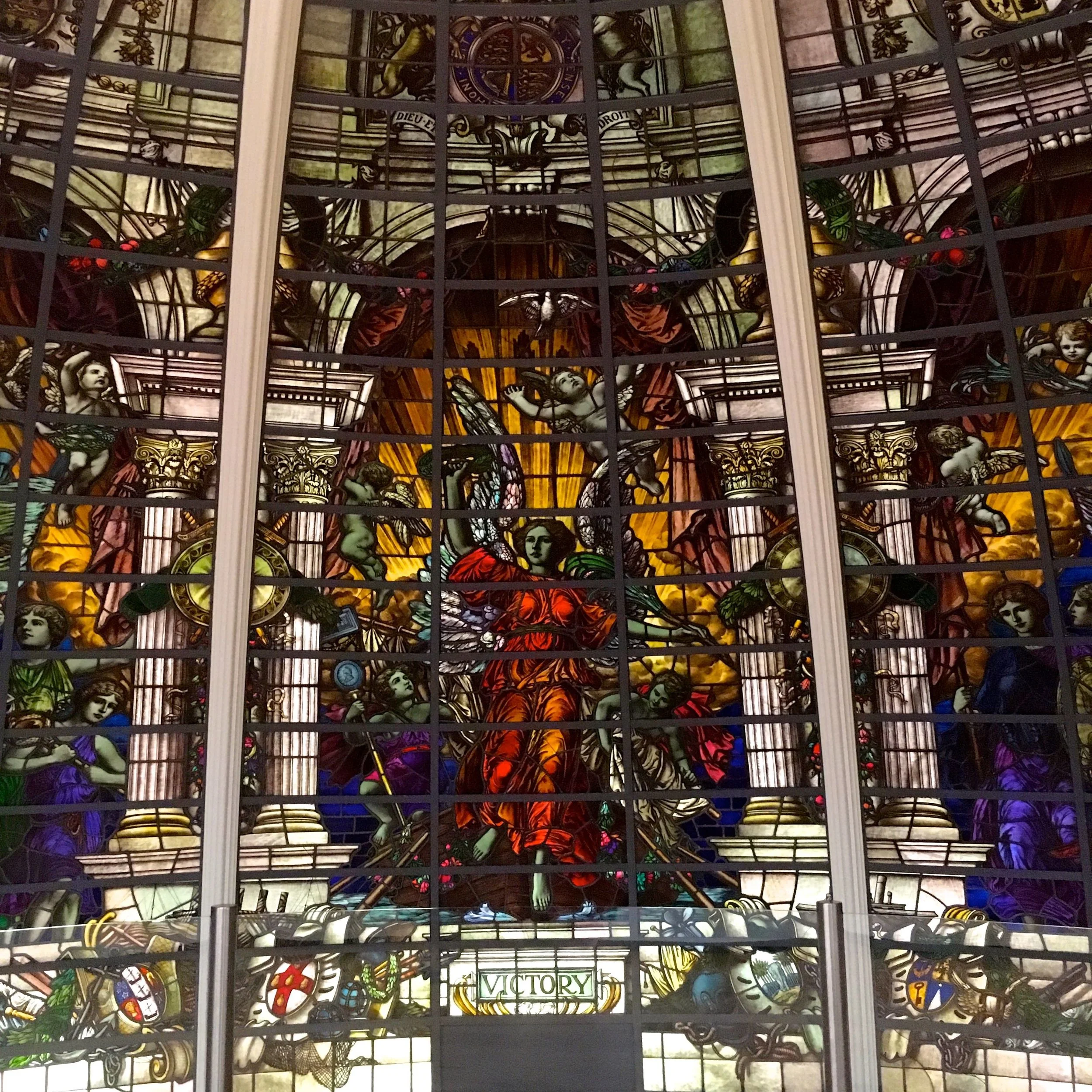 The windows were commissioned shortly after the First World War and formed part of a memorial to the sixty members of Baltic Exchange staff who lost their lives during the war. They were unveiled in 1922 and consisted of a half-dome with five large windows below it.