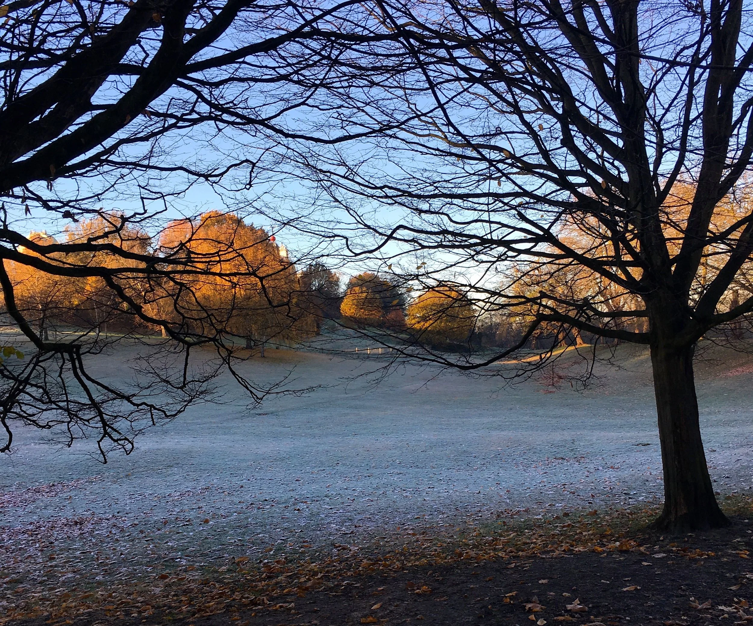 As I walked further into the park the frost was still heavy and the bare trees provided the perfect foil for the view.