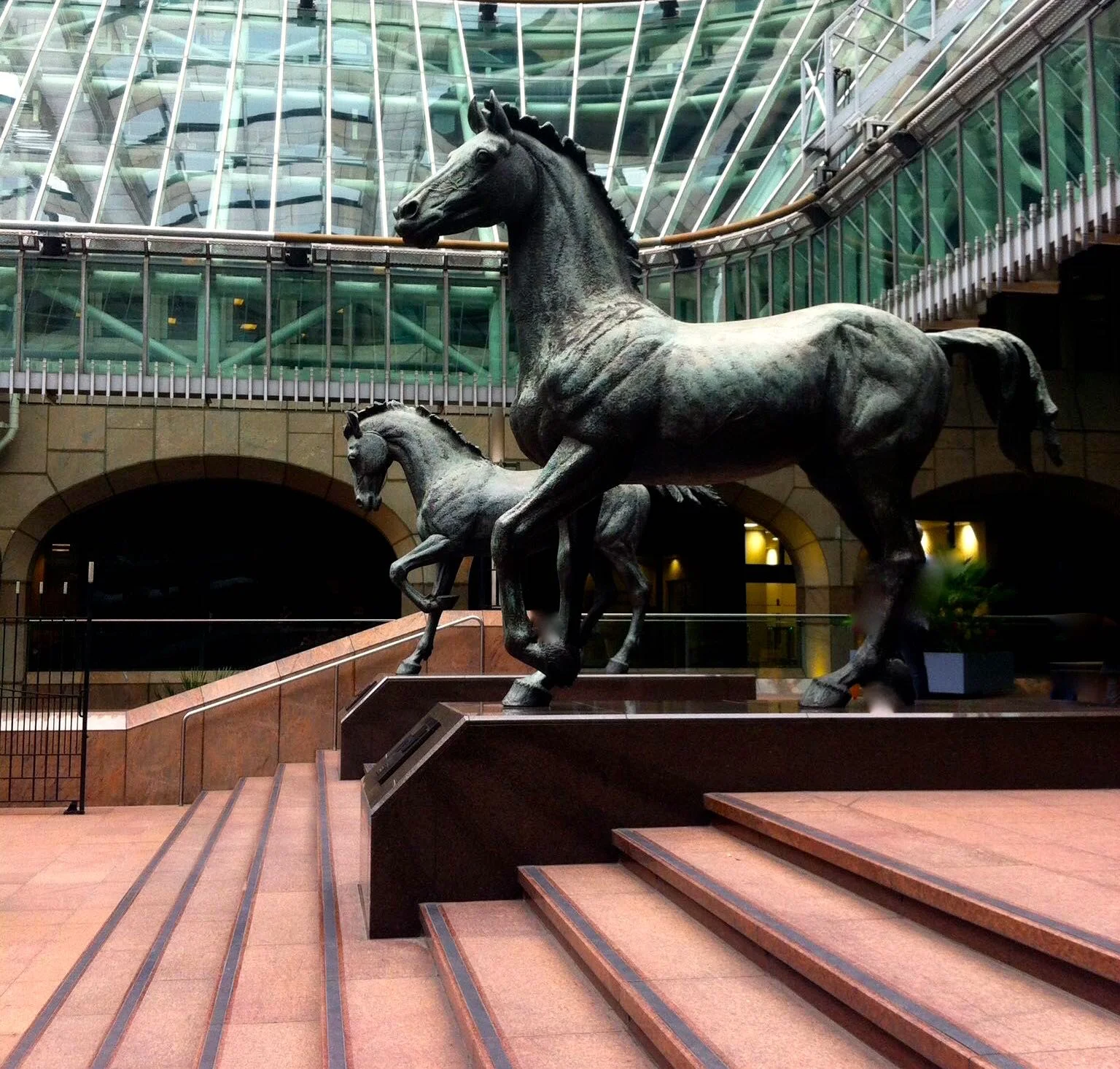 Heading around the corner I found myself at Minster Court and somewhere I'd rushed past many times before. I'd noticed the horses but never stopped to look at them more closely. The sculptures, of three horses by Althea Wynne are said to have been nicknamed Dollar, Yen and Sterling.