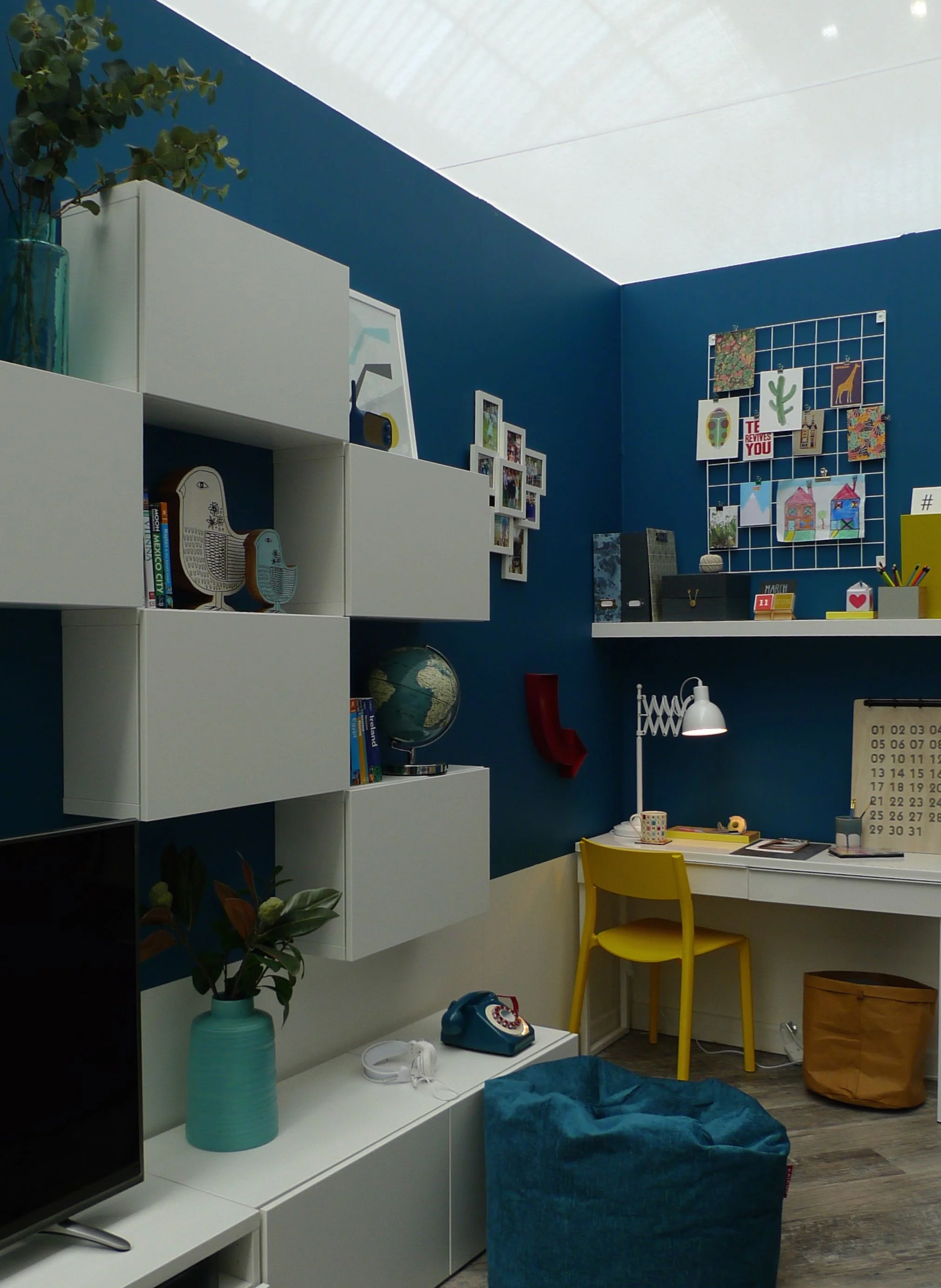 The last of the room sets from the Ideal Home Show is this family room which has been designed for the whole household to use. It's bolder than you might imagine, with bold shades of teal and pops of red and yellow. There's plenty going on too, so there really is something for everyone.