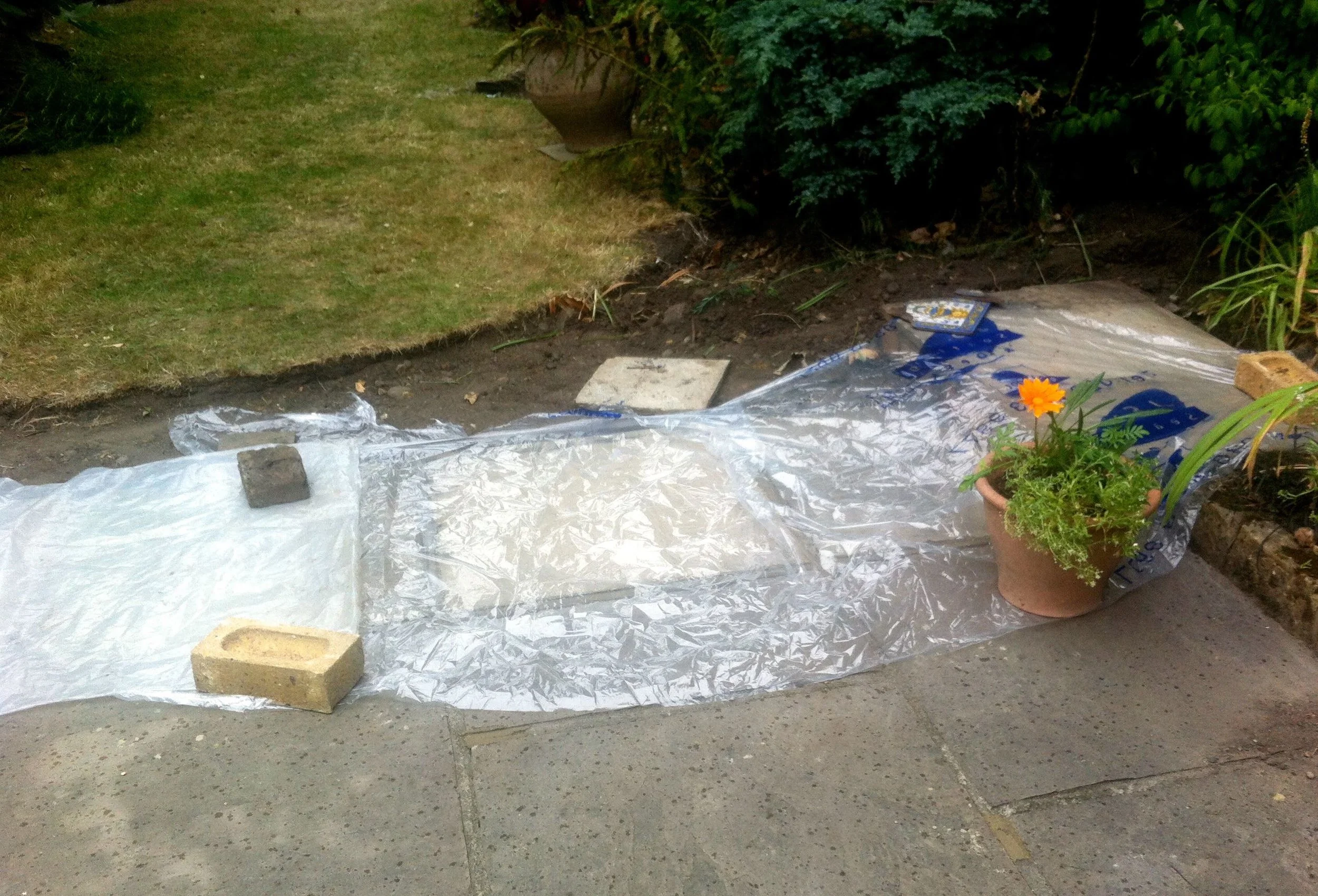 And with impeccable timing, just as the row was laid along came the rain. Plastic sheets were quickly found and used to cover the new row of patio to protect the pointing and to stop it being washed away. It worked and on Sunday we uncovered the new row for it to bask in the sun just as much as we did.