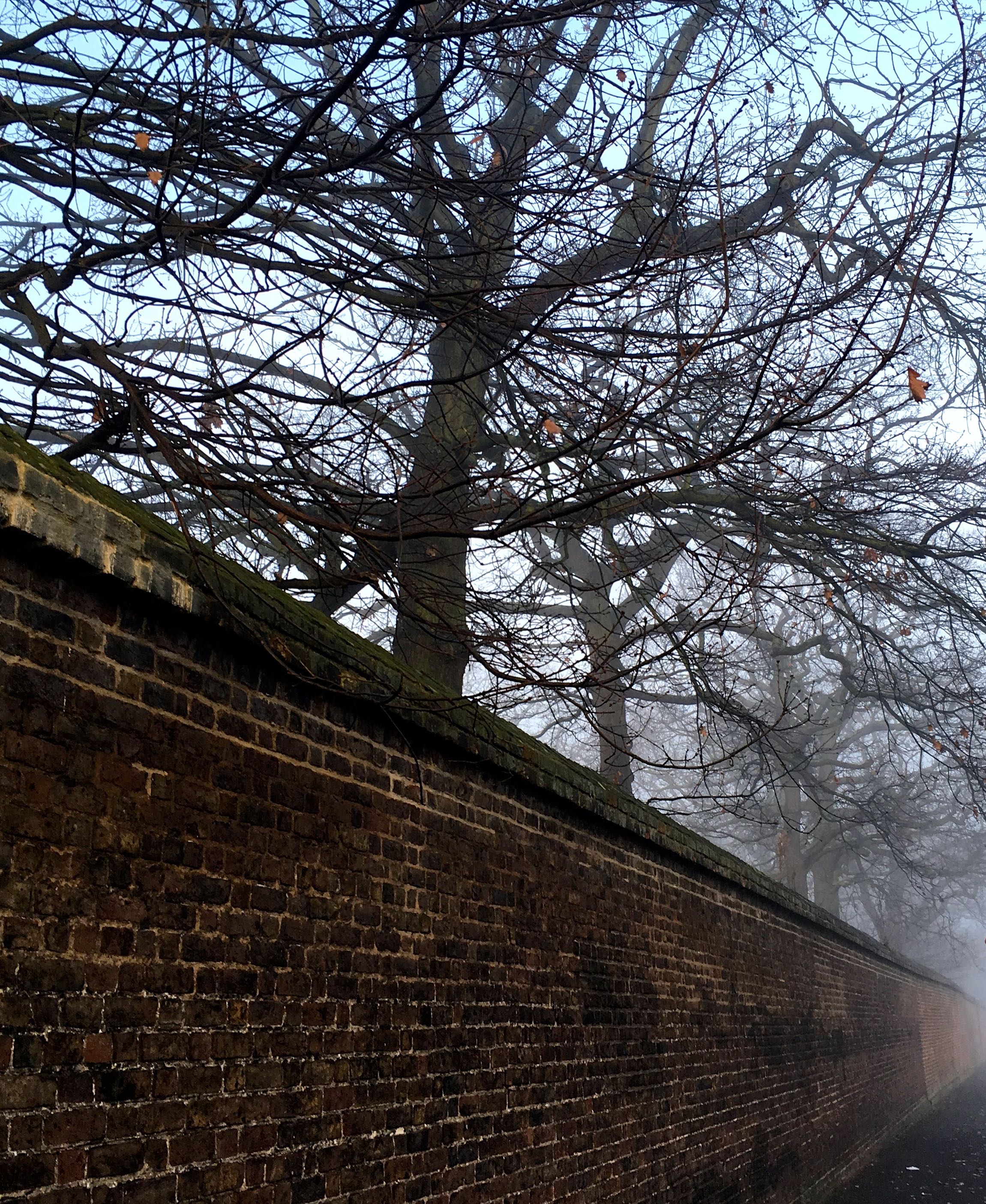 And my mornings now start with some brick wall love, perhaps January will be the month I capture that well enough to do it justice. I view it from outside the park, but marvel at its size, materials and even lack of straightness (really) and it looked even more mysterious in the December fog.