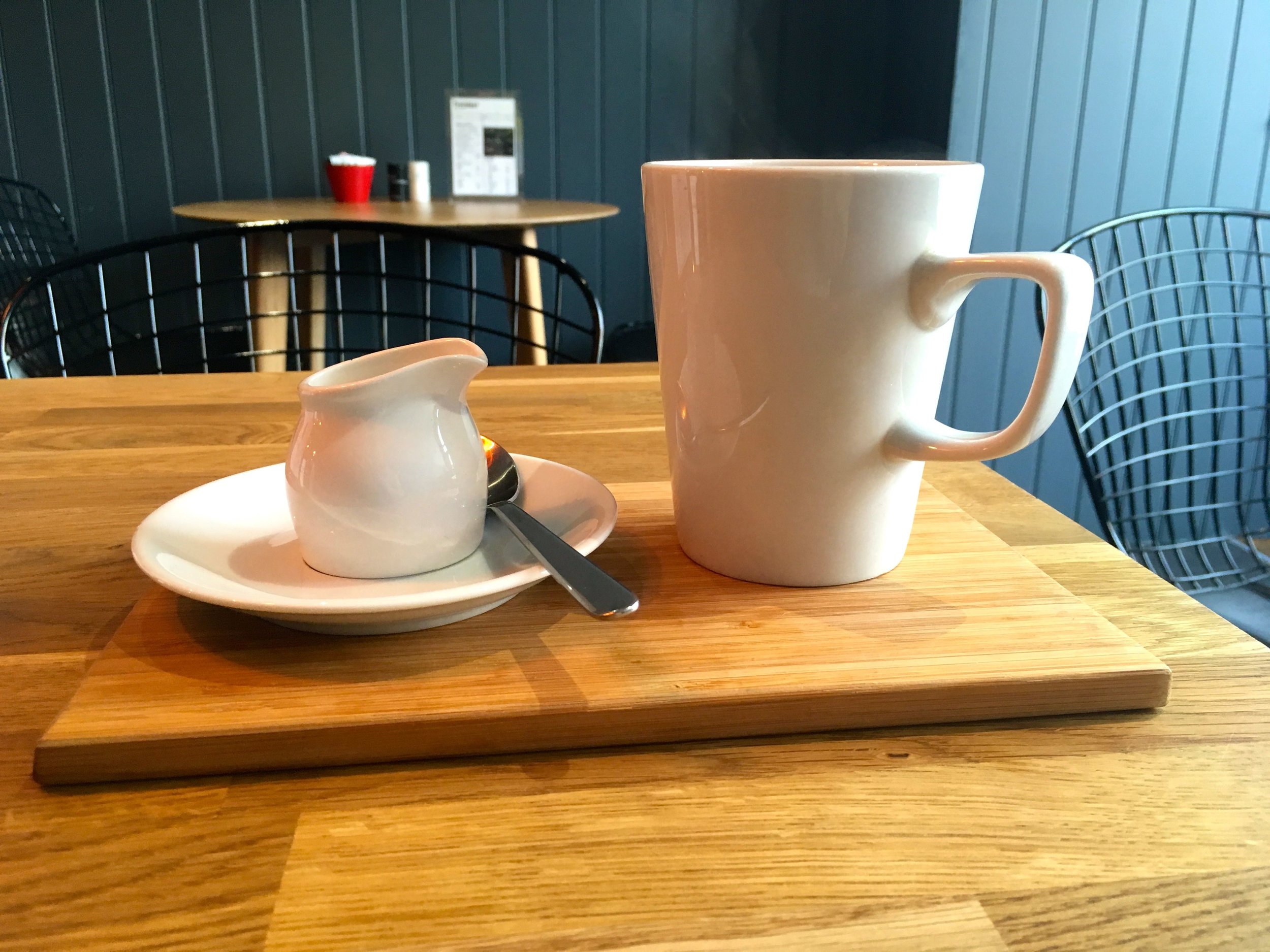 Tea arrives in a mug, with milk on a board and with somewhere to put your tea bag, so that's good. The mix of materials and colours work and are carried through into the serving ware, all give it a modern feel I think.