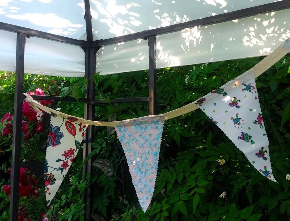 With the sewing machine threaded up, I started by joining my braids and ribbons together, and then simply attached my cut out triangles to that leaving approximately the width of the bunting between each flag. Again that wasn't precise, but it worked out well. I didn't want the bunting to be too spaced out, and I did remember to leave some extra ribbon at each end so it was easy to tie into place.