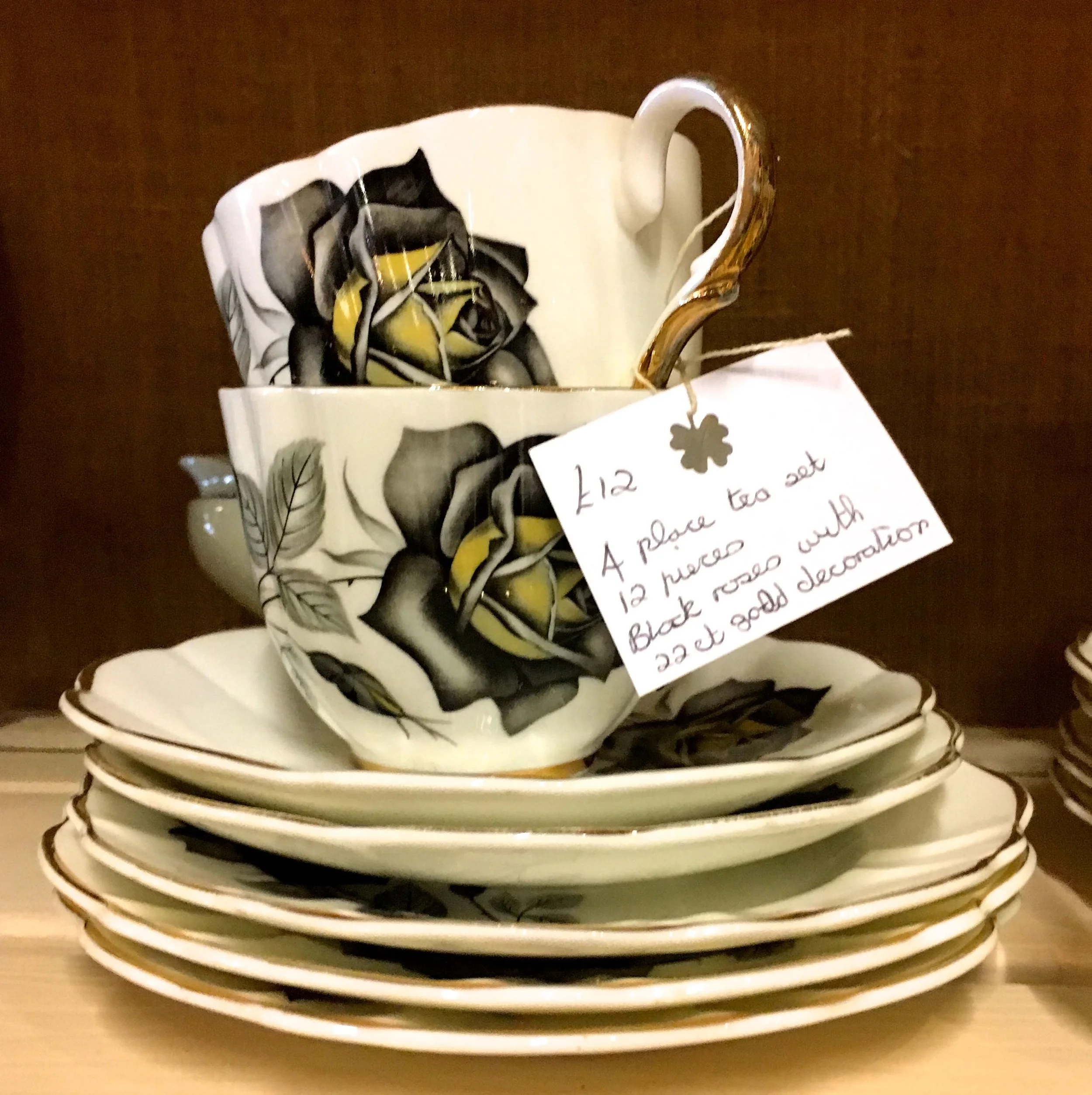 I was amazed by how many different sets they had, as well as how many different designs. The jewelled coloured cups, and black saucers, caught my eye, but I wasn't sure about the circular patterns on the side plates. Black featured quite a lot I discovered, in roses too.