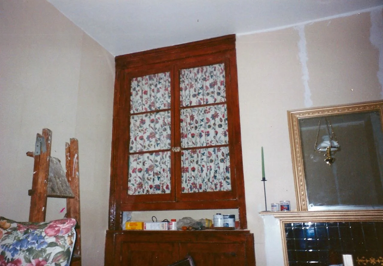 In the dining room, you can see work is still underway, but that built in cupboard was my pride and joy. I personally, and painstakingly, scraped years and years worth of paint off of the original in-built cupboard, and it turned out rather well. The curtains behind the glass were a genius idea as they hid a multitude of sins, but I remember mum thinking how old-fashioned they were, as it was something her nan would have had.