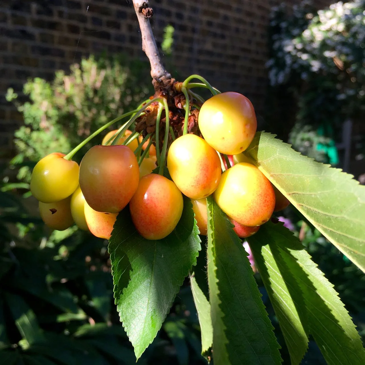 Now just look at those cherries. These were I think out of the reach of the visiting six year olds, but I suspect they may have had help. I've never seen as many cherries in a single bunch like this on our tree.